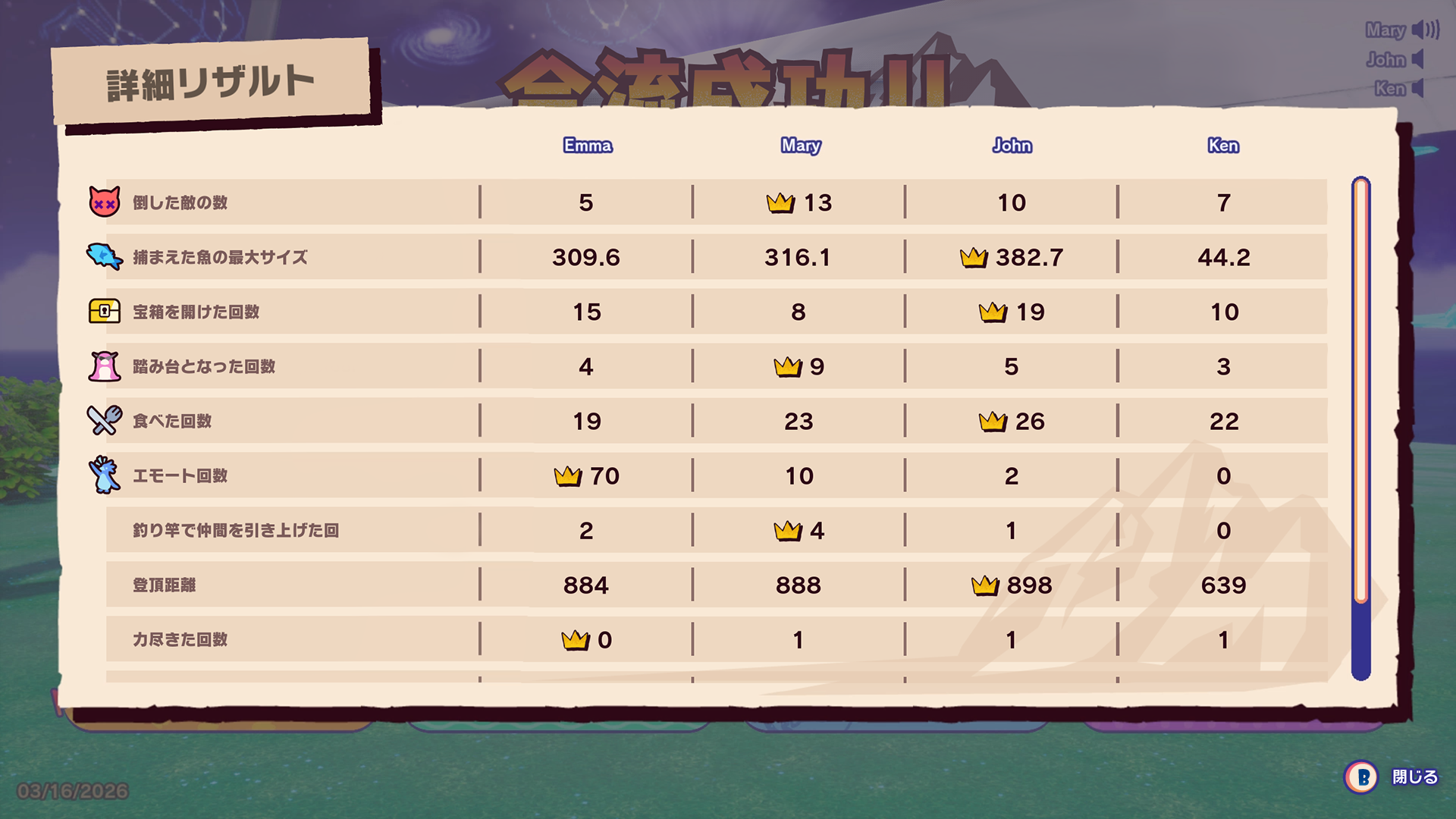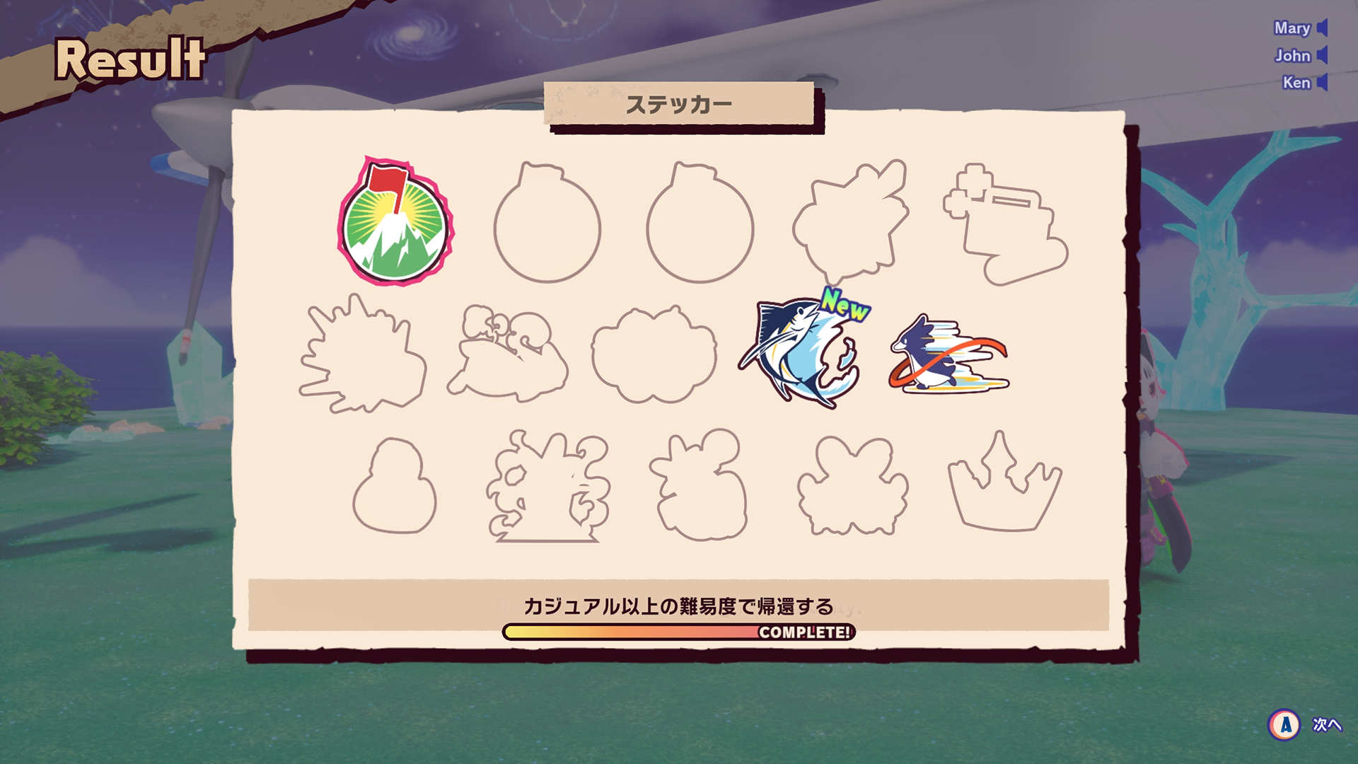 「エニグマ諸島」は毎日地形が変化するため、挑戦するたびに異なる登山体験が楽しめます。リザルトでは各項目で最も貢献したプレイヤーに王冠を授与。さらに、特定条件を達成すると限定ステッカーを獲得できます。コンプリートを目指しましょう!
