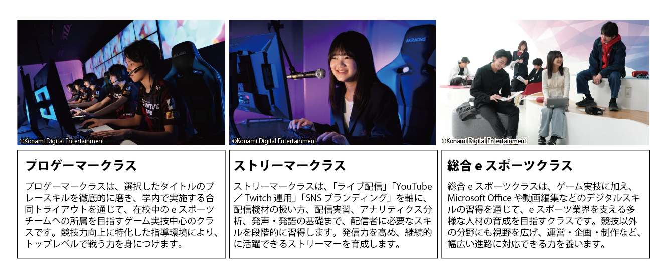 株式会社コナミデジタルエンタテインメントは、KONAMI eスポーツ学院において、2027年度入校生より「プロゲーマークラス」「総合eスポーツクラス」に加え、新たに「ストリーマークラス」を設けることをお知らせします。(※1)