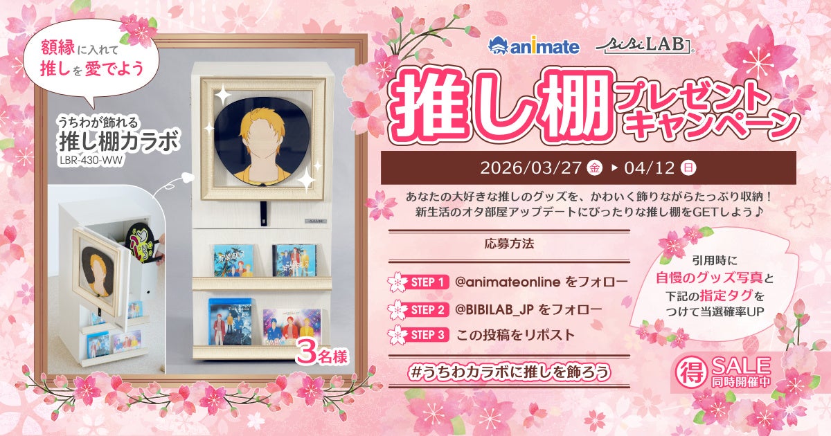 取り扱い開始記念セールとあわせて、ビビラボの「うちわが飾れる推し棚カラボ(LBR-430WW)」が抽選で3名様に当たるコラボキャンペーンもスタート。アニメイト・ビビラボの公式Xアカウントのフォローと、該当投稿のリポストで応募完了。さらに、「自慢の推しグッズ画像」と「#うちわカラボに推しを飾ろう」タグを添えた引用リポストで、当選確率UPのチャンスも。愛する推しへの想いを込めて、どしどしご応募ください!