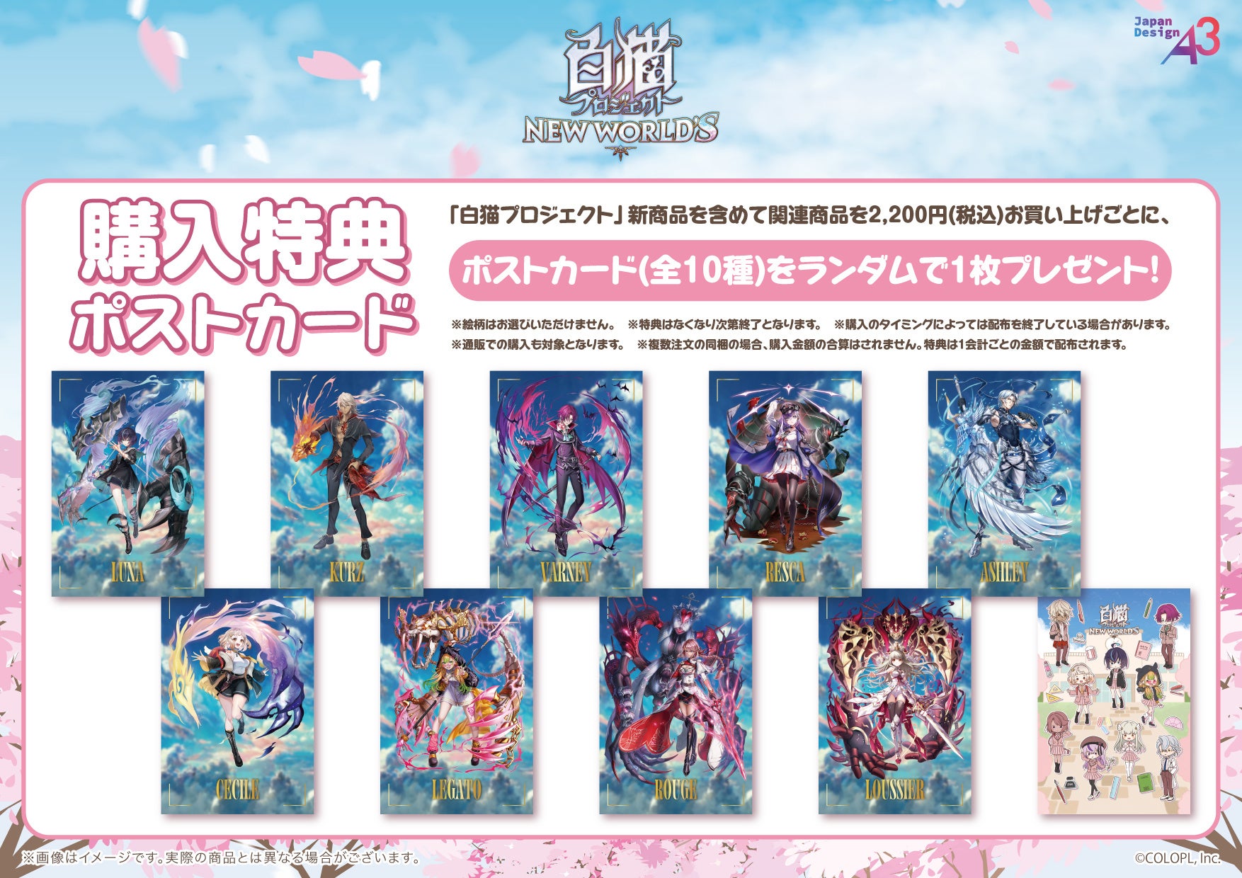株式会社コロプラ(代表取締役社長 上席執行役員 CEO:宮本貴志、本社:東京都港区、以下「コロプラ」)は、スマートフォン向け本格3DアクションRPG『白猫プロジェクト NEW WORLD’S(以下、『白猫』)』の桜をテーマにした新グッズが、株式会社A3が運営するeeo Store 池袋本店にて販売されることが決定し、本日2026年3月27日(金)より通販と店舗受取予約受付が開始されたことをお知らせします。