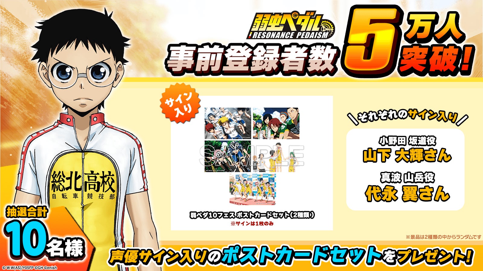 事前登録5万人突破を記念して、「弱虫ペダル レゾナンス・ペダイズム」公式X(@yowapeda_ism)にて、豪華キャストのサイン入りグッズが抽選で合計10名様に当たる!フォロー&RPキャンペーンを開催いたします。
