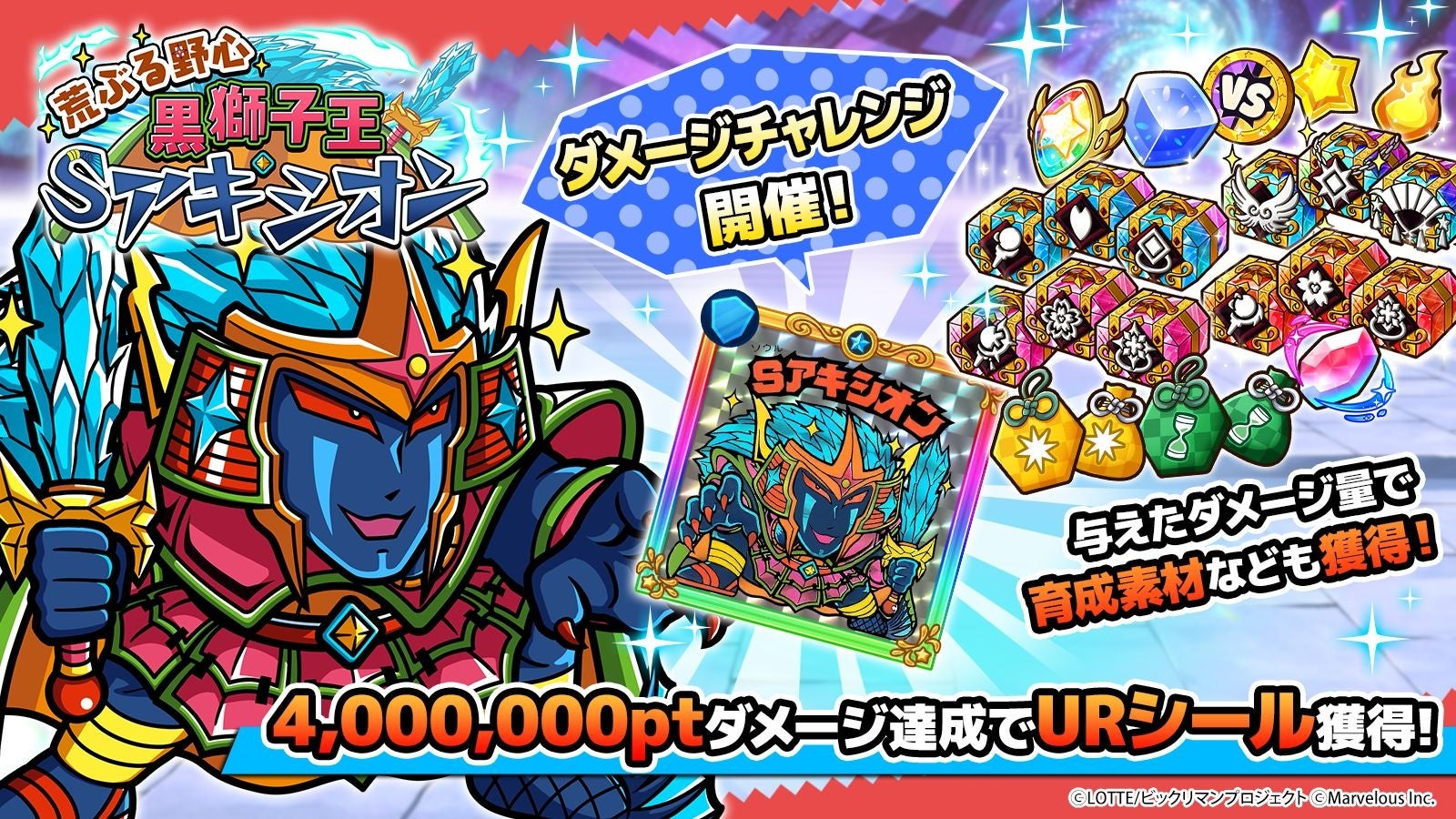 専用の称号や、400万Ptのダメージ到達でURシール「[黒獅子王]Sアキシオン」を獲得できますので、ぜひご参加ください!
