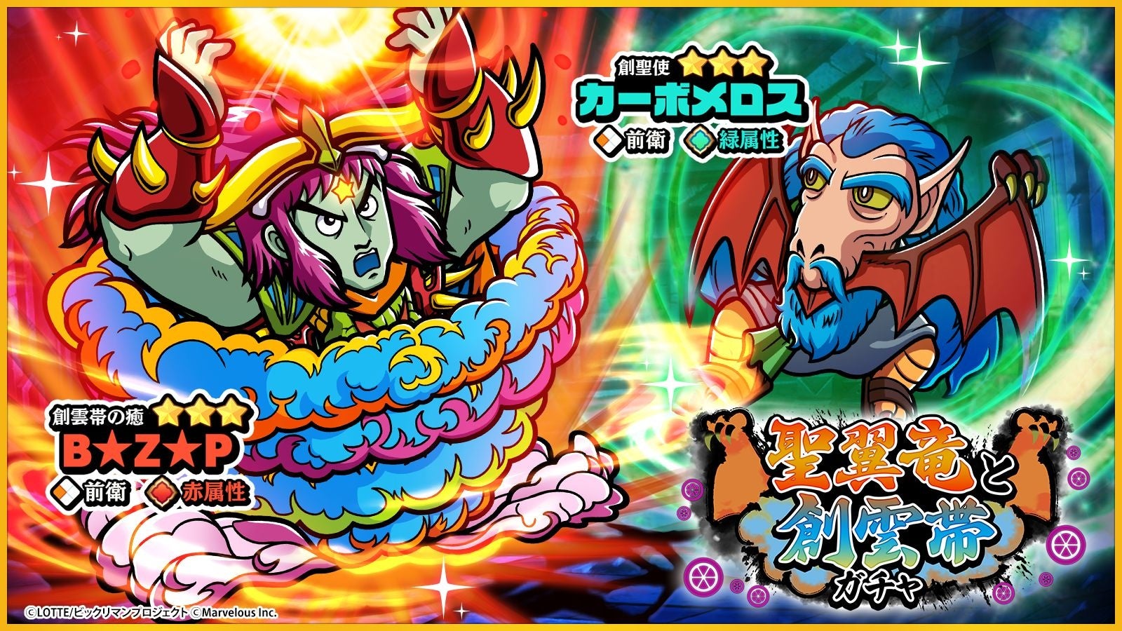 新たな☆3キャラクター「[創雲帯の癒]B★Z★P」「[創聖使]カーボメロス」が登場する、「聖翼竜と創雲帯ガチャ」を開始いたしました。