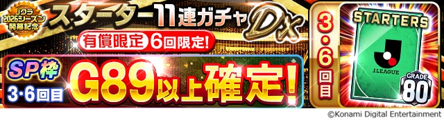 Jクラ2026シーズン開幕を記念した特別なガチャです。3回目・6回目はSPECIAL枠で「G89以上スターター確定(セレクトスキル確定)」と、「お気に入りクラブG80以上スターターガチャ券」のおまけ付き!