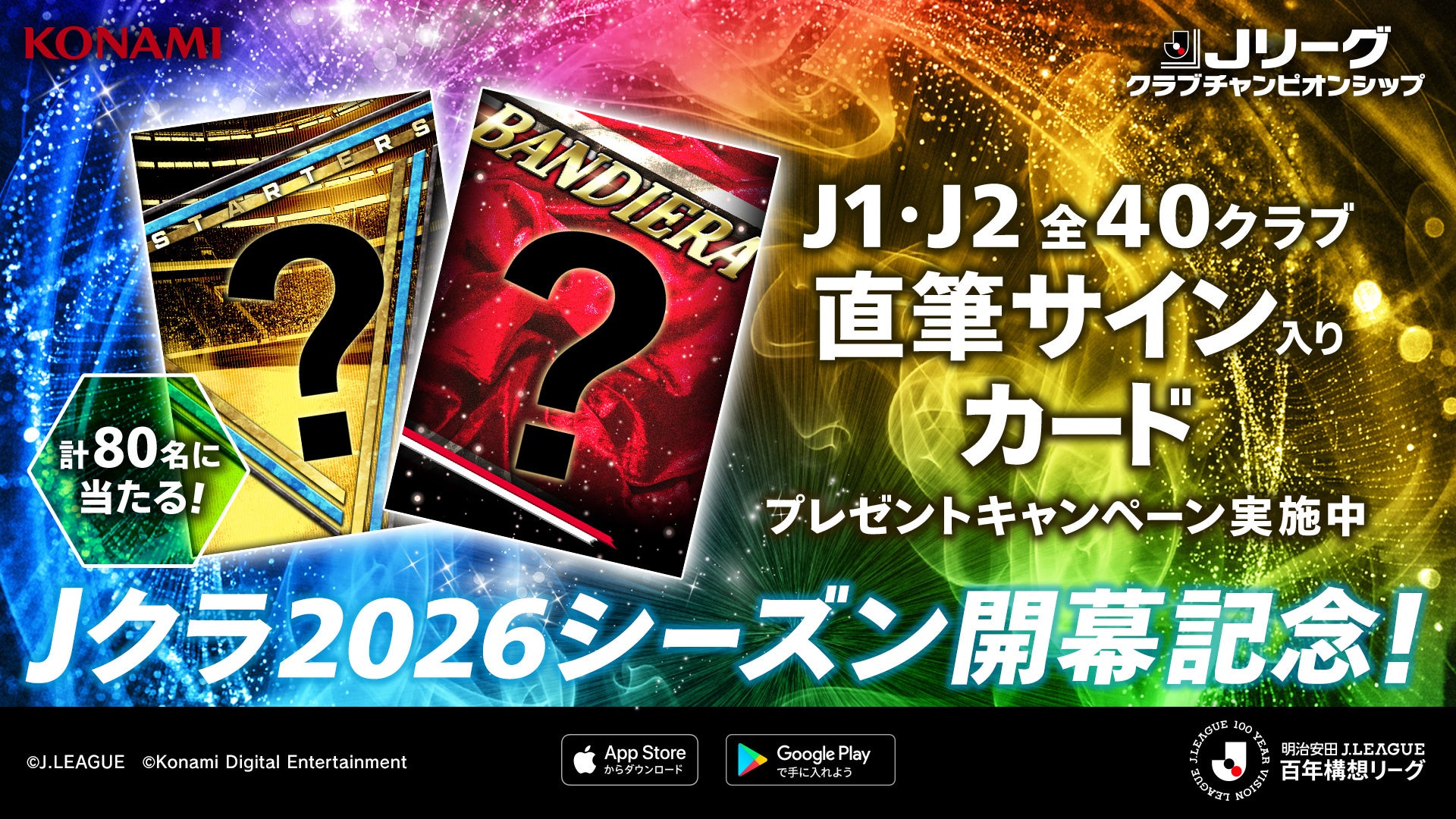 本キャンペーンでは、J1・J2全40クラブから総勢160名の選手が「スターター」カードとして登場するほか、クラブの象徴ともいえる選手40名が「バンディエラ」カードとして登場しています。また新機能 「アディショナルセンス」の搭載や、期間中ログインするだけで「G80以上スターターガチャ券」や「G85以上ガチャ券」がもらえる「Jクラ2026シーズン開幕記念!スペシャルログインボーナス」なども開催しています。
