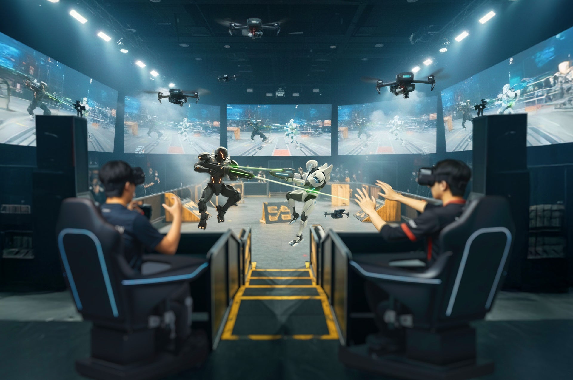 XiGAのコンセプトは、「アナログな物理」と「デジタルなロボティクス」が衝突する非対称型PvP体験。VRゴーグルを装着してモーションチェアに搭乗し、4脚ロボット「Unitree GO2」を実際に操縦。ナーフ銃を装備したロボットで、参加者がその場でスポンジブロックを積み上げた「物理要塞」を突破しにいきます。