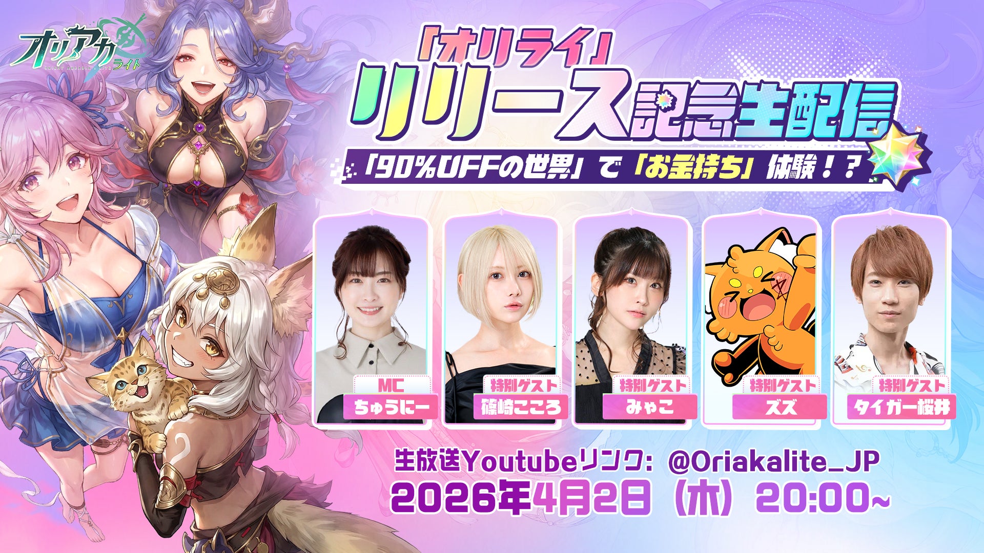 4月2日には、『オリアカ:ライト』リリース記念スペシャル生配信も予定されています。豪華ゲスト陣が登場し、視聴者の「90%OFFの願い」をその場で叶えるかも…!?みゃこ、篠崎こころ、ズズ、ちゅうにー、タイガー桜井などの人気配信者が出演予定です。あらゆる願いを叶える「90%OFFの力」が配信で再び発動するかもしれません!