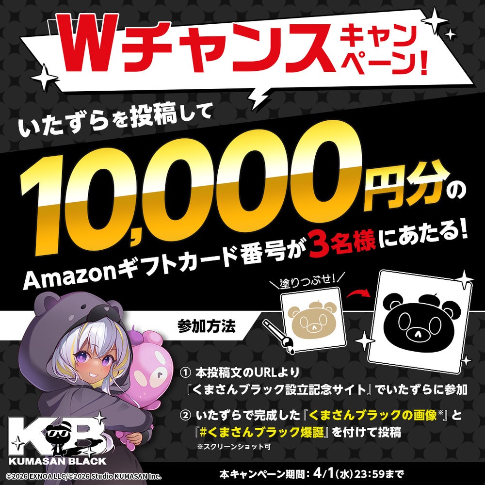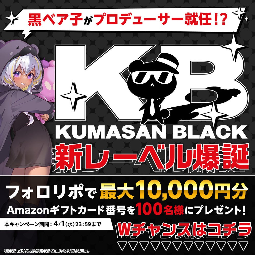 黒ベア子が新レーベル「くまさんブラック」プロデューサー就任を記念して最大10,000円分のAmazonギフトカード番号が当たるフォロー&リポストキャンペーンをXにて開催中です。