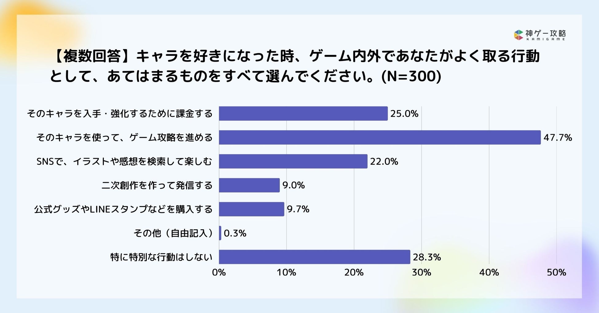 キャラクターを好きになった時、ゲーム内外でよく取る行動については、「そのキャラを使って、ゲーム攻略を進める」が47.7%で最多でした。