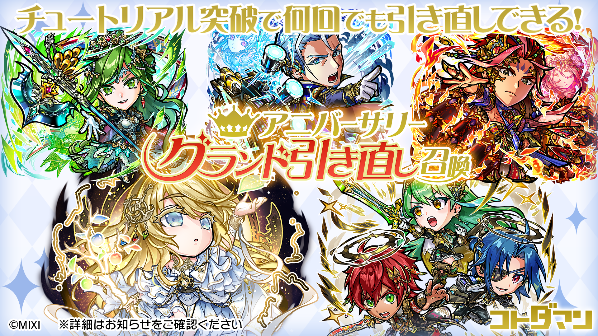 グランドコトダマン※が1体確定で出現し、対象の中から気に入ったキャラクターが出るまで引き直すことができる「アニバーサリーグランド引き直し召喚」を開催します。コラボを機にプレイを始める方にもおすすめです。