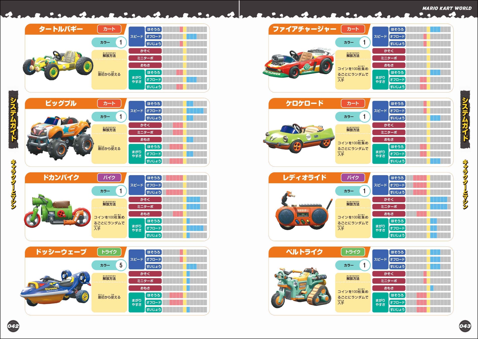 キャラクターとマシンの性能もわかりやすく紹介。挑戦するコースによって、いろいろな組み合わせを試してみよう。