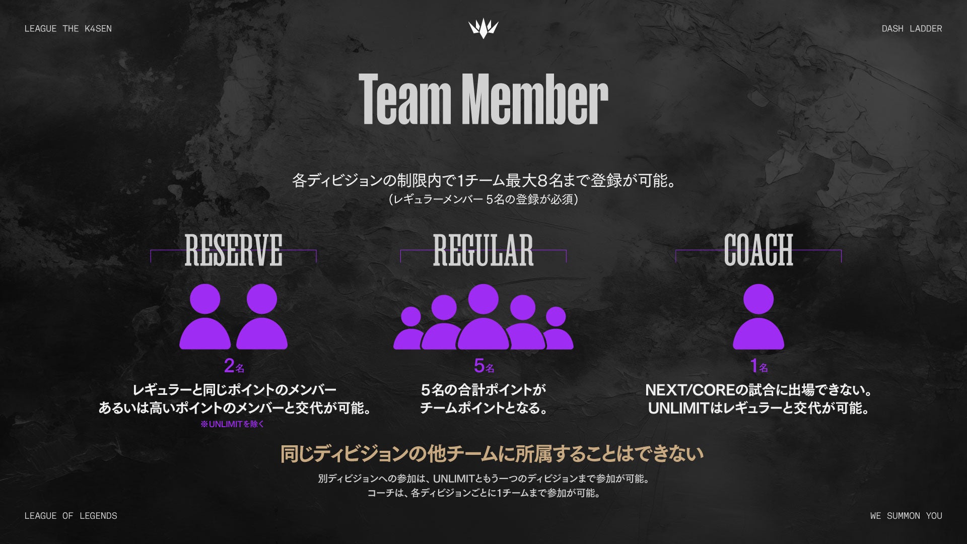 複数チームへの所属の禁止 :同一ディビジョン内での重複所属は不可。別ディビジョンであれば、UNLIMITともう1つのディビジョンまでの重複参加が可能