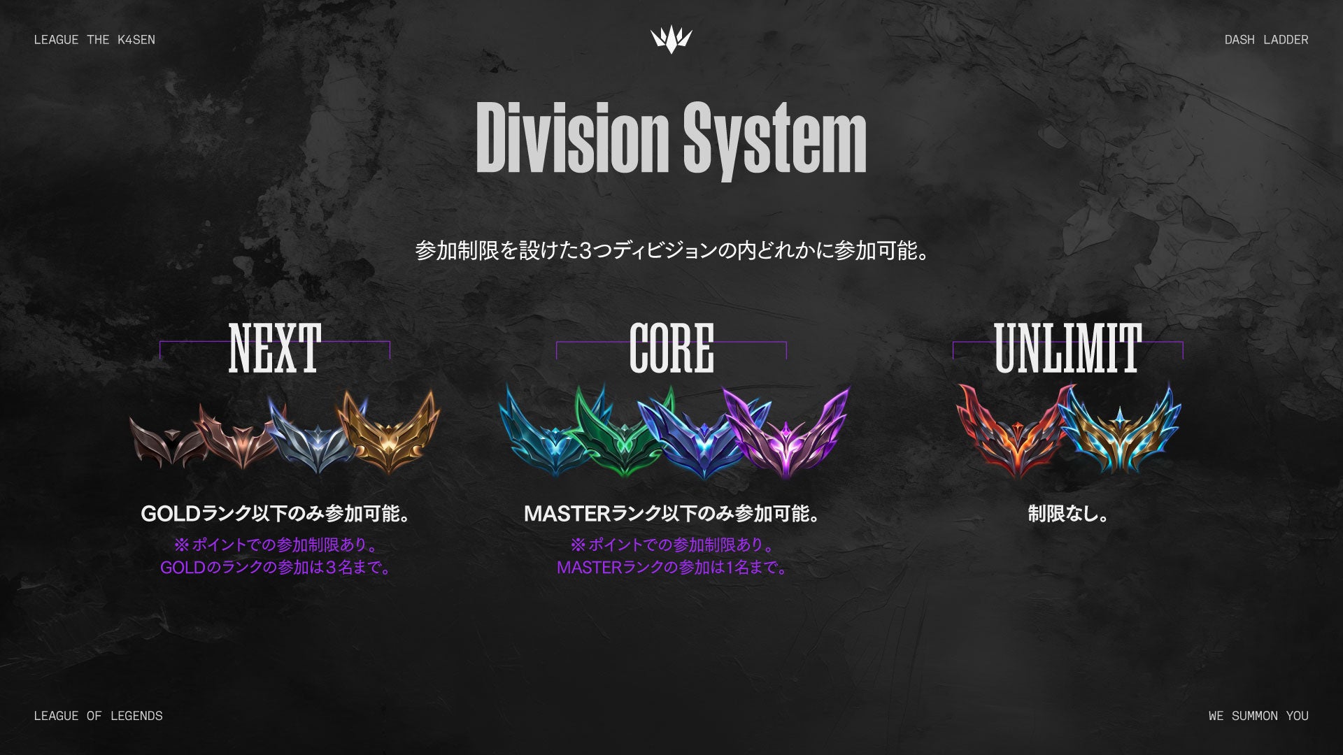 参加者の実力に合わせるため、3つのディビジョンを用意。各チーム構成には以下の制限事項を遵守する必要があります。