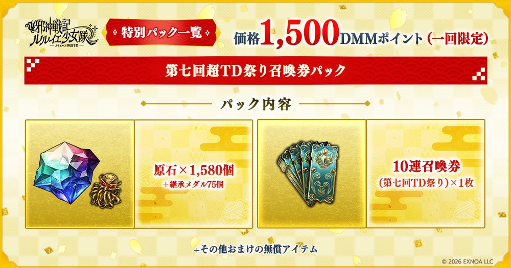 イベント開催期間中、1回限定で「原石×1,580個」「継承メダル×75個」や10連召喚券(第七回TD祭り)x1枚などの貴重なアイテム、その他便利アイテムがパックとなった「第七回超TD祭り召喚券パック」(価格:1,500DMMポイント)で販売します。