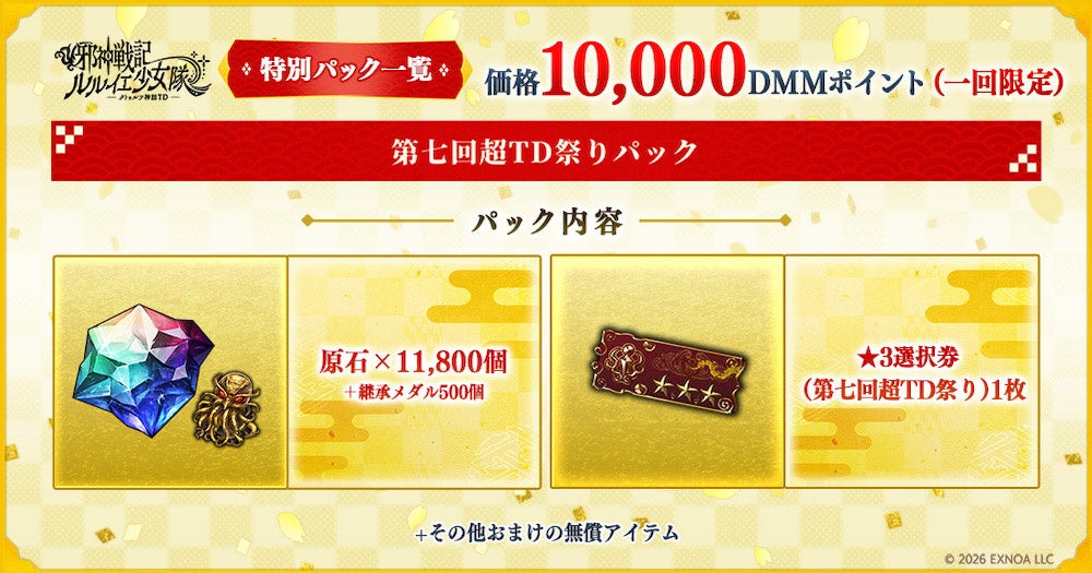 イベント開催期間中、1回限定で「原石×11,800個」「継承メダル×500個」などの貴重なアイテムやコラボガチャで登場する最高レア新キャラクターから選べるアイテム、その他便利アイテムがパックとなった「第七回超TD祭りパック」(価格:10,000DMMポイント)で販売します。