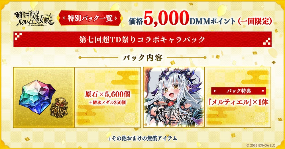 イベント開催期間中、1回限定で「原石×5,600個」「継承メダル×250個」と限定コラボキャラクター「メルティエル」、その他便利アイテムがパックとなった「第七回超TD祭りコラボキャラパック」を5,000DMMポイントで販売します。
