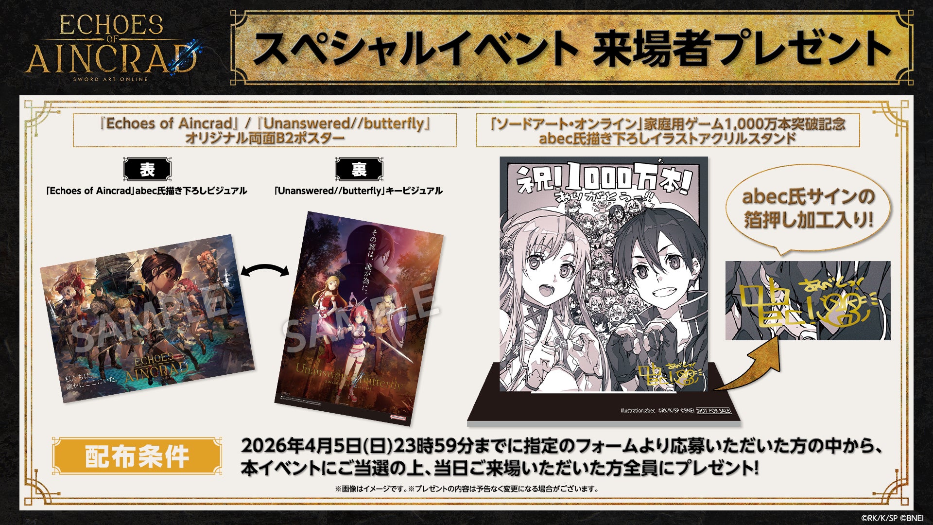 4月5日(日)23時59分までに「Echoes of Aincrad」スペシャルイベントにご応募いただいた方の中から本イベントに当選&当日ご参加された方には、2つの来場者プレゼントをお渡しします!