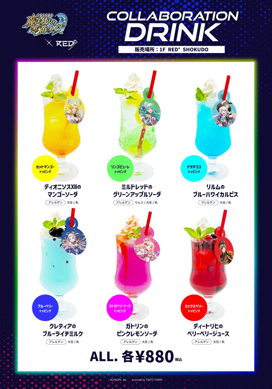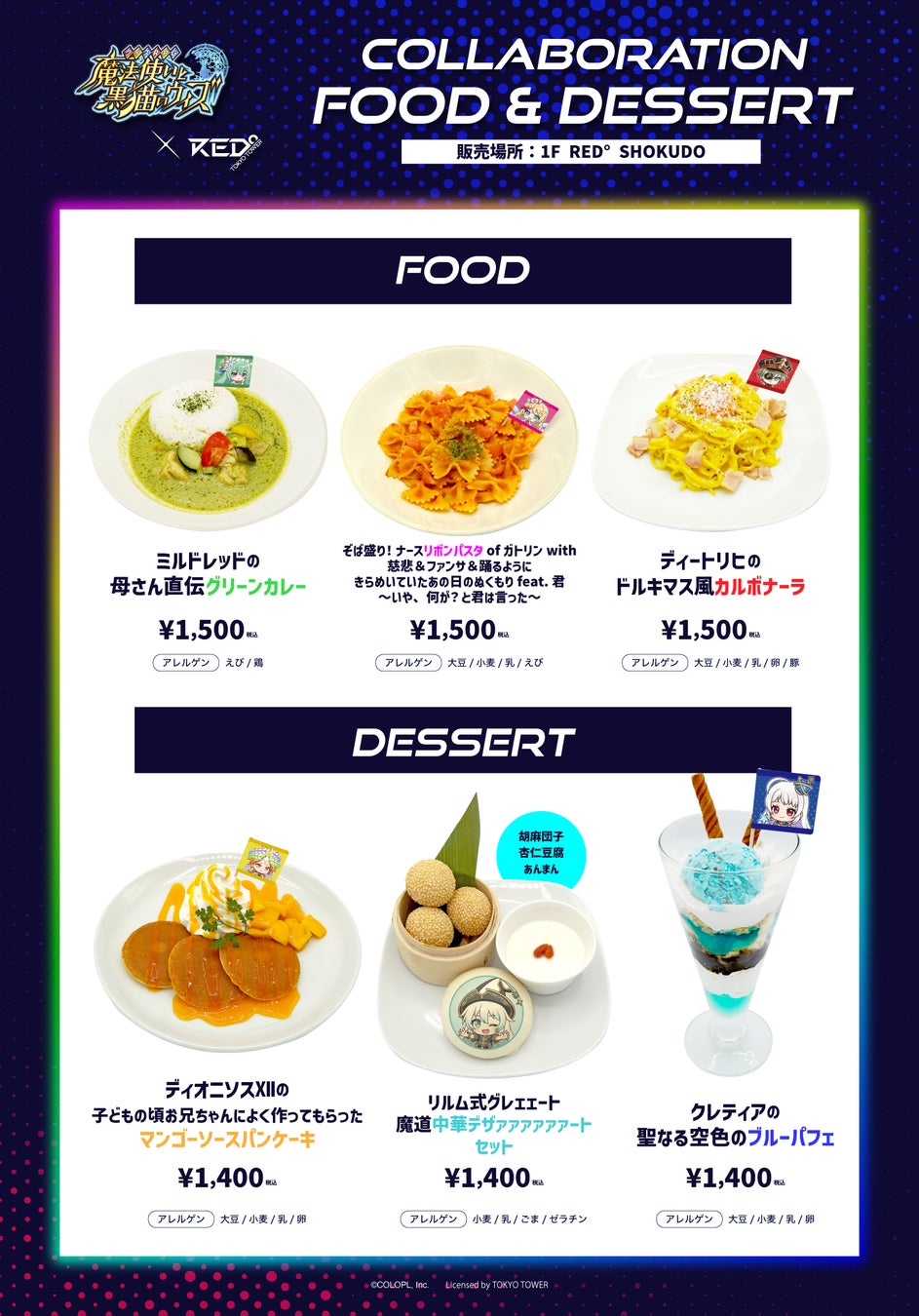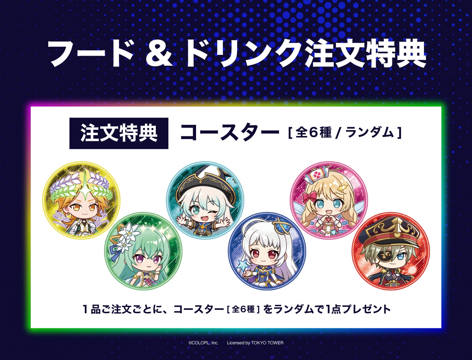1F「RED° SHOKUDO」ではコラボカフェを開催いたします。こちらでは、キャラクターを表現したコラボドリンクやフードメニューをお楽しみいただけます。1品ご注文ごとに、コースター(全6種)をランダムで1枚プレゼントします。