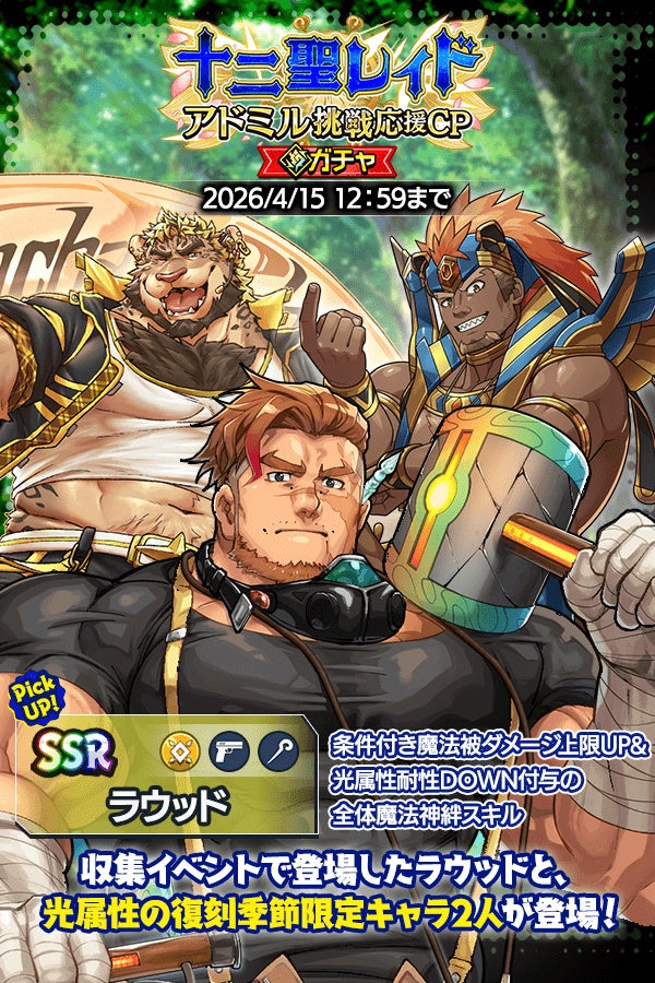 さらに、「HAPPY イースター♪フェスティバル」で登場した「ラウッド」に加え、光属性の復刻季節限定キャラクター2体が登場する十二聖レイド「アドミル」挑戦応援キャンペーンガチャも開催!