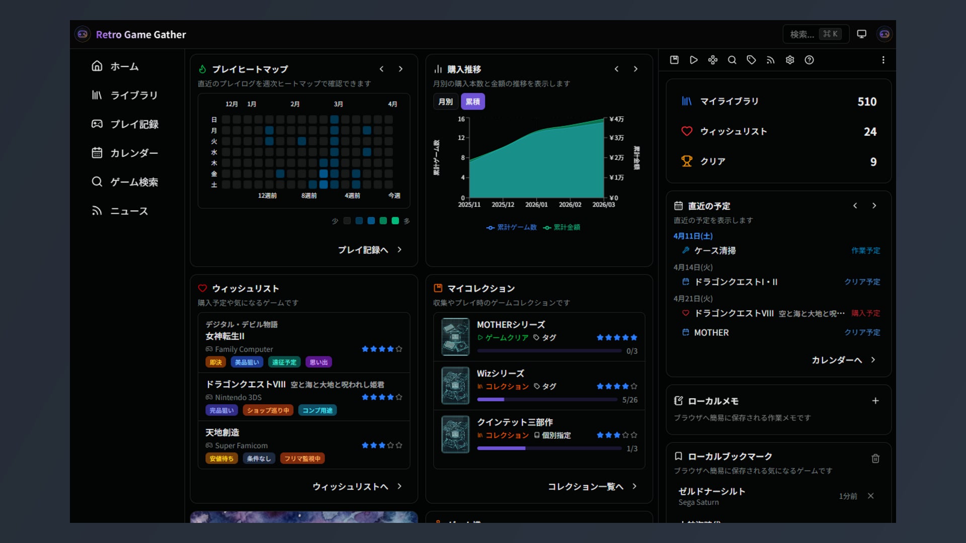今回のアップデートでは、プレイログを軸として「いつ・何を・どう遊んだか」を把握できるプレイ記録分析機能、タイトルテキストやファイル、タグ指定といったライブラリ一括登録手段の拡充、そして「同一ゲームの複数ソフト所有」や「ゲーム機メンテナンスの時系列記録」を可能とするプレミアム機能の強化もあわせて実施しています。