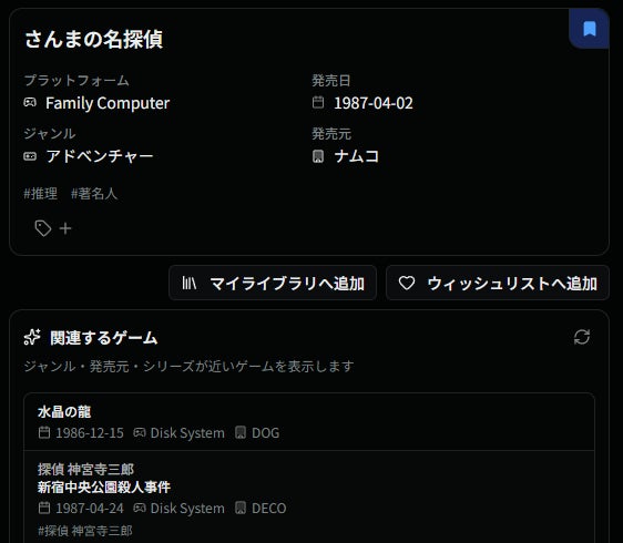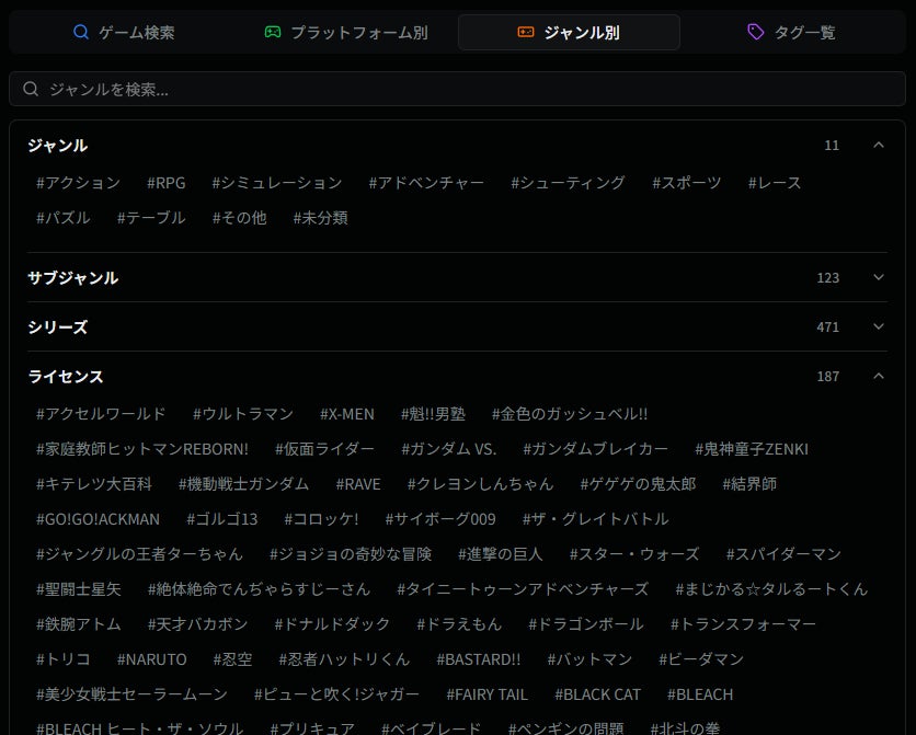従来の大まかなジャンル区分に加え、サポートジャンル(サブジャンル、シリーズ、ライセンス)をゲームごとに設定しました。