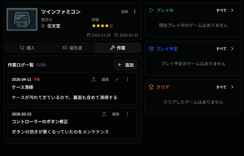 登録したゲーム機ごとにメンテナンスの記録を残せるようになりました。