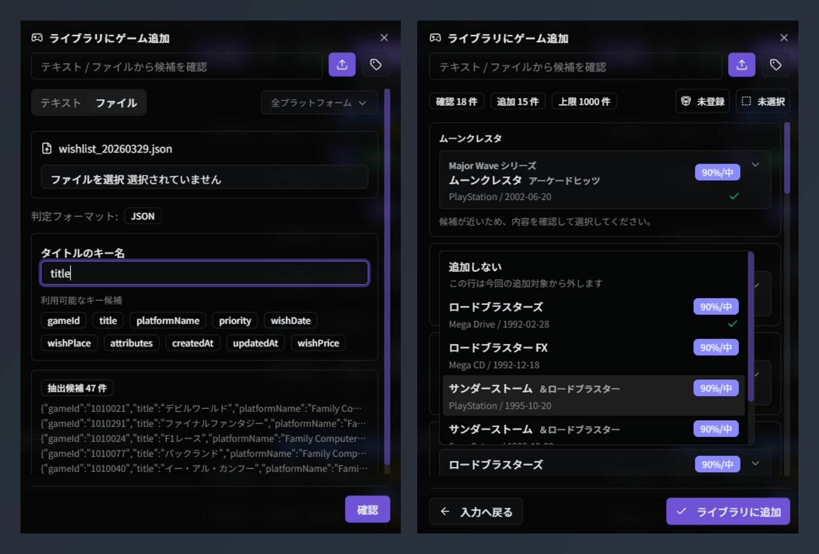 プレミアム会員向けには、タグを指定して該当ゲームをまとめて登録するタグ一括登録も利用できます。確認時にはタイトルごとの一致率も表示されるため、取り込み時の確認もしやすくなっています。
