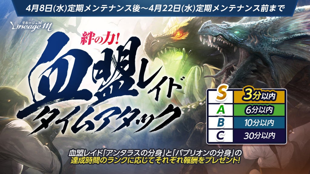 PCオンラインRPG「リネージュ」のモバイル版タイトル『Lineage M(以下、リネージュM)』のサービス、運営をしているエヌ・シー・ジャパン株式会社(本社:東京都港区、代表取締役:林 元基(イム ウォンキ)、以下エヌシージャパン)は、2026年4月8日(水)に複数のボスモンスターが襲来する新イベントを含むイベント3種の開始をお知らせします。