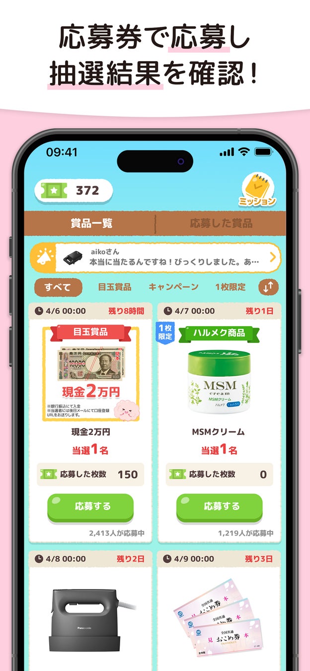獲得した応募券で、ハルメクの人気定番商品や家電、日用品、ギフト券など豪華賞品に応募可能。透明性の高い抽選システムにより、安心・安全に懸賞を楽しめます。