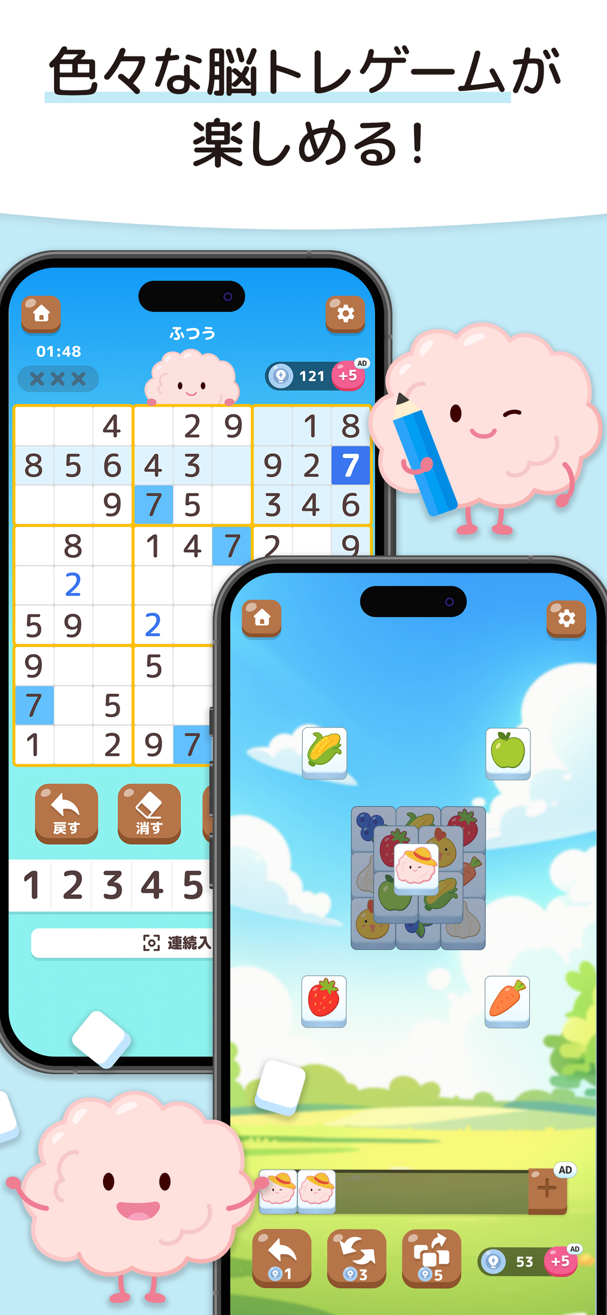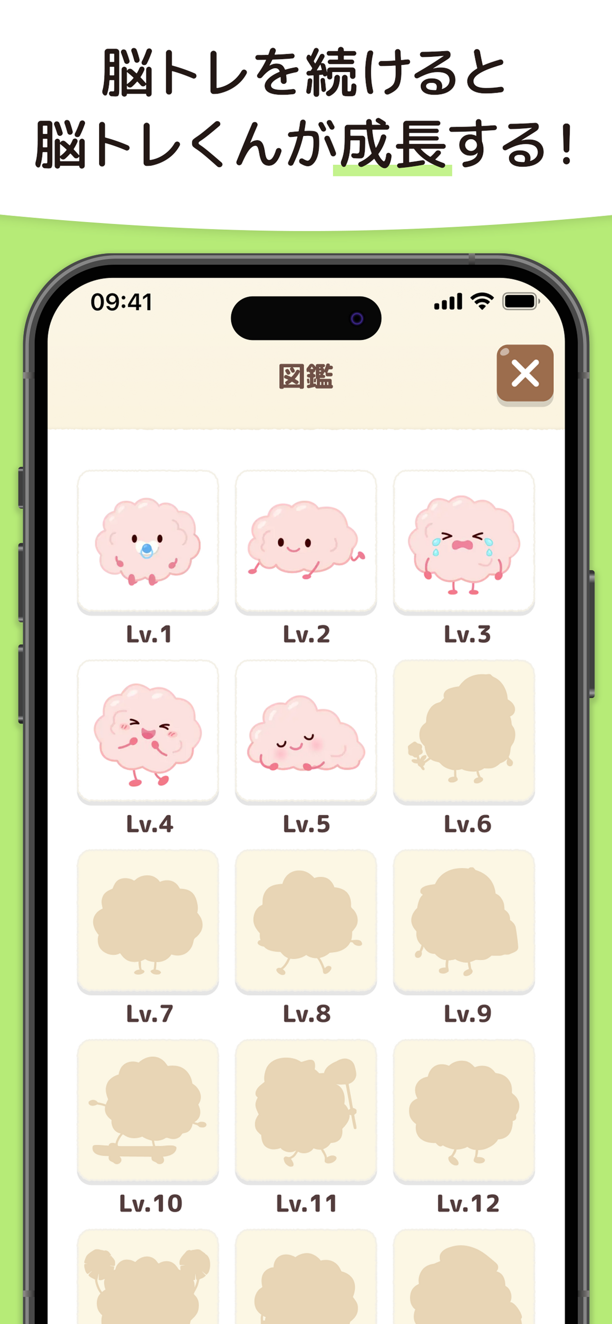 脳トレを続けることでゲームキャラクター「脳トレくん」が成長。成長した脳トレくんを図鑑にコレクションできる楽しみや、キャラクターへの愛着が、継続のモチベーションに繋がります。