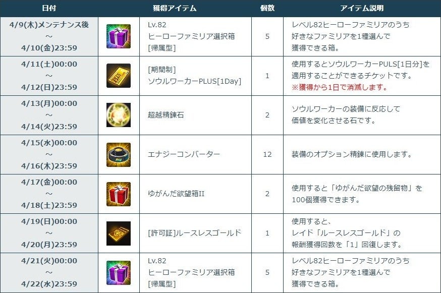 イベント期間中にログインすることで、「ソウルワーカーPLUS」や「Lv.82ヒーローファミリア選択箱[帰属型]」などのゲーム内アイテムを獲得できます。さらに、期間中の週末(金・土・日)には、公式Xアカウントにて追加報酬が得られるキャンペーンも実施いたします。