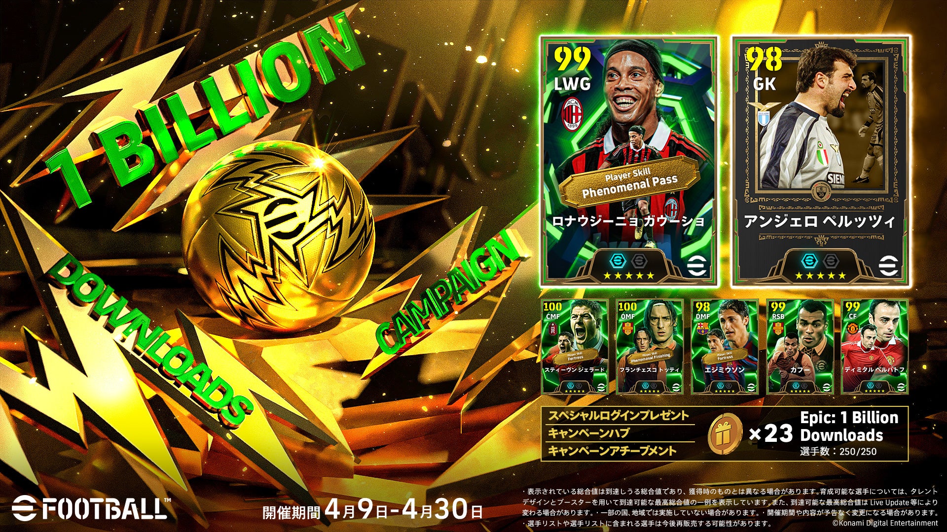 株式会社コナミデジタルエンタテインメント(以下、KONAMI)は、基本プレー無料で家庭用ゲーム機、PC、モバイルで配信中の『eFootball™』が、世界累計10億ダウンロードを突破したことを記念したキャンペーンを、4月9日(木)より開始したことをお知らせします。