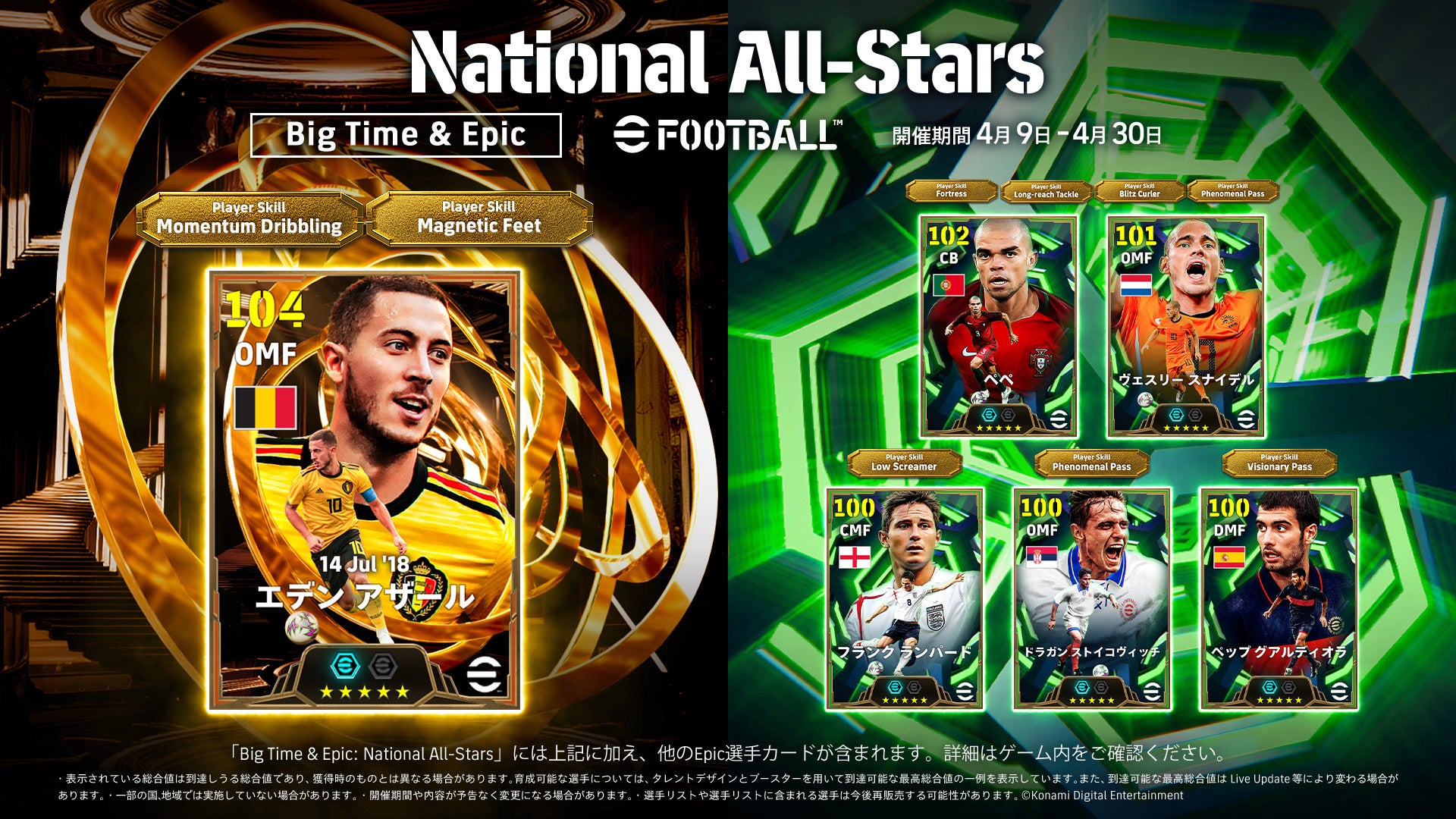 ゲーム内には、「BigTime:エデン アザール」、「Epic:ペペ」、「Epic:ヴェスリー スナイデル」らが、「Big Time & Epic: National All-Stars」として登場中です。対象となるスペシャル選手リストには、計6名のエピック選手がラインアップされています。