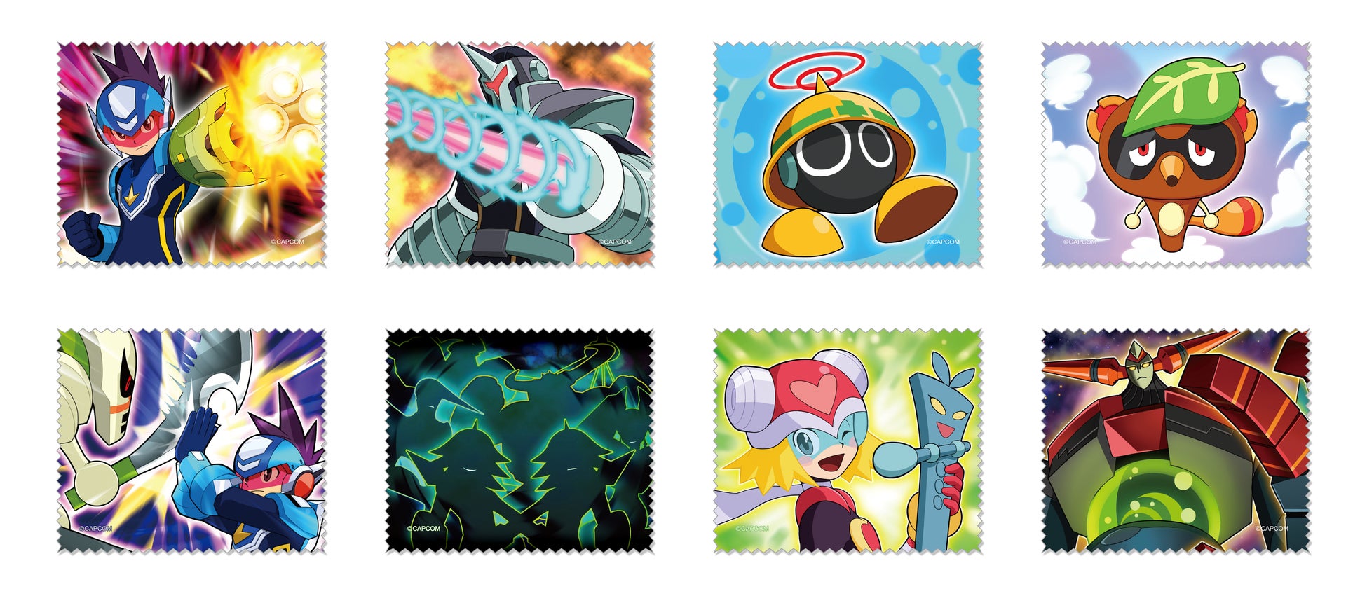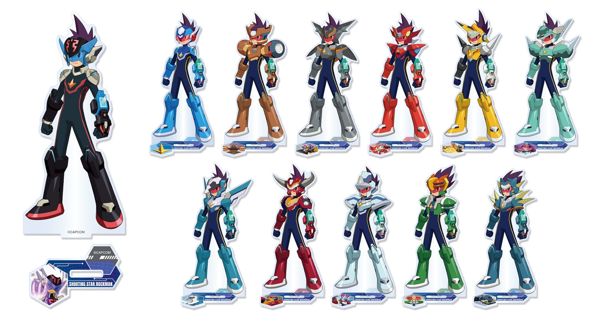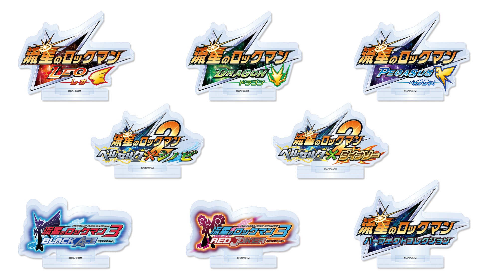 『流星のロックマン』にてロックマンが変身した「スターフォース」の姿をかわいくデフォルメ化した「マスコットぬいぐるみ(S賞)」や『流星のロックマン3』にて登場する「ノイズチェンジ」のデザインを使用した「アクリルスタンド(B賞)」など、各タイトルに登場するロックマンの変身姿を使用したアイテムを多数展開! ほかにも全8タイトルのロゴを使用した「アクリルブロックスタンド(C賞)」などのコレクタブルなアイテムもご用意しております。
