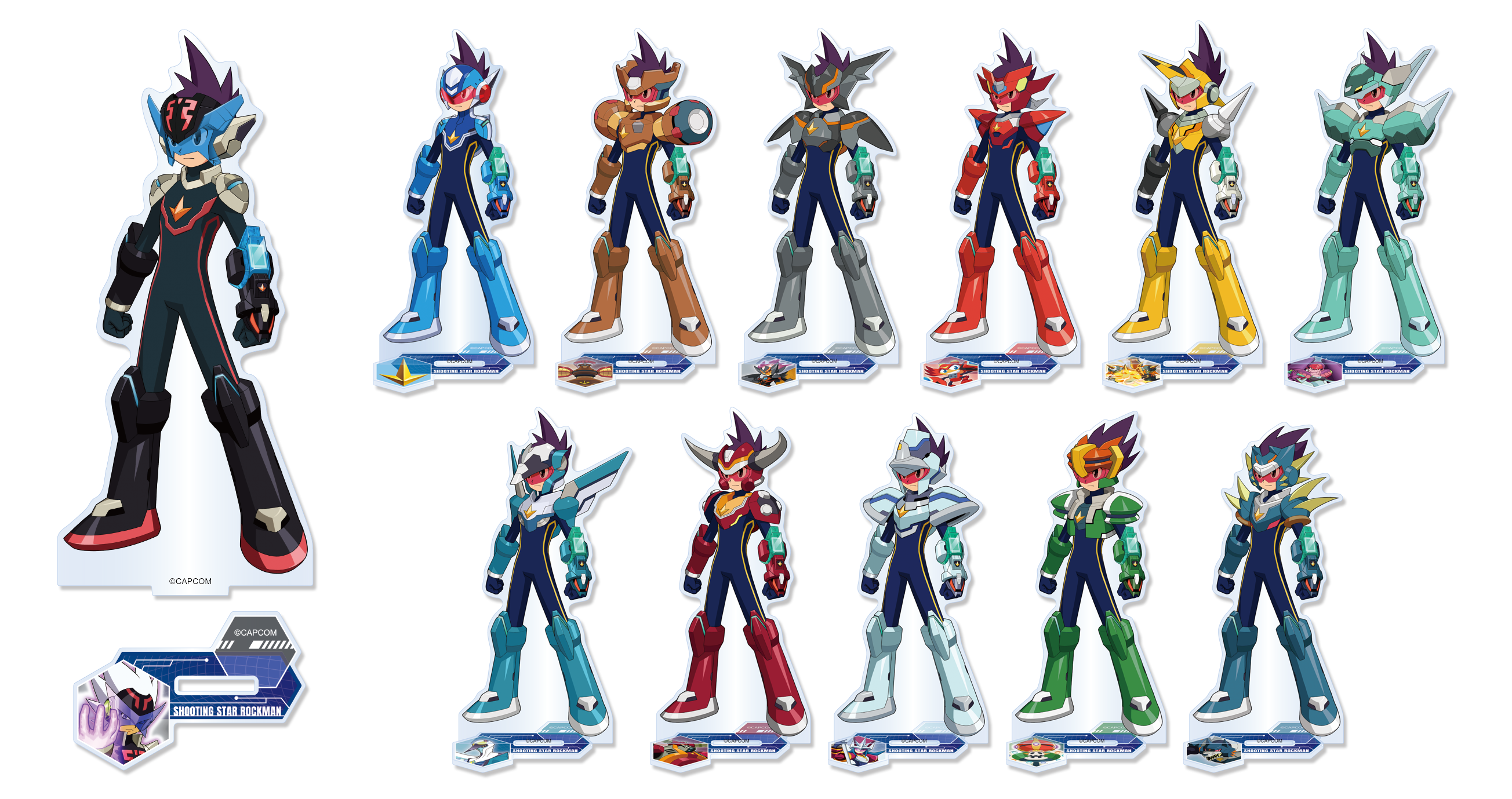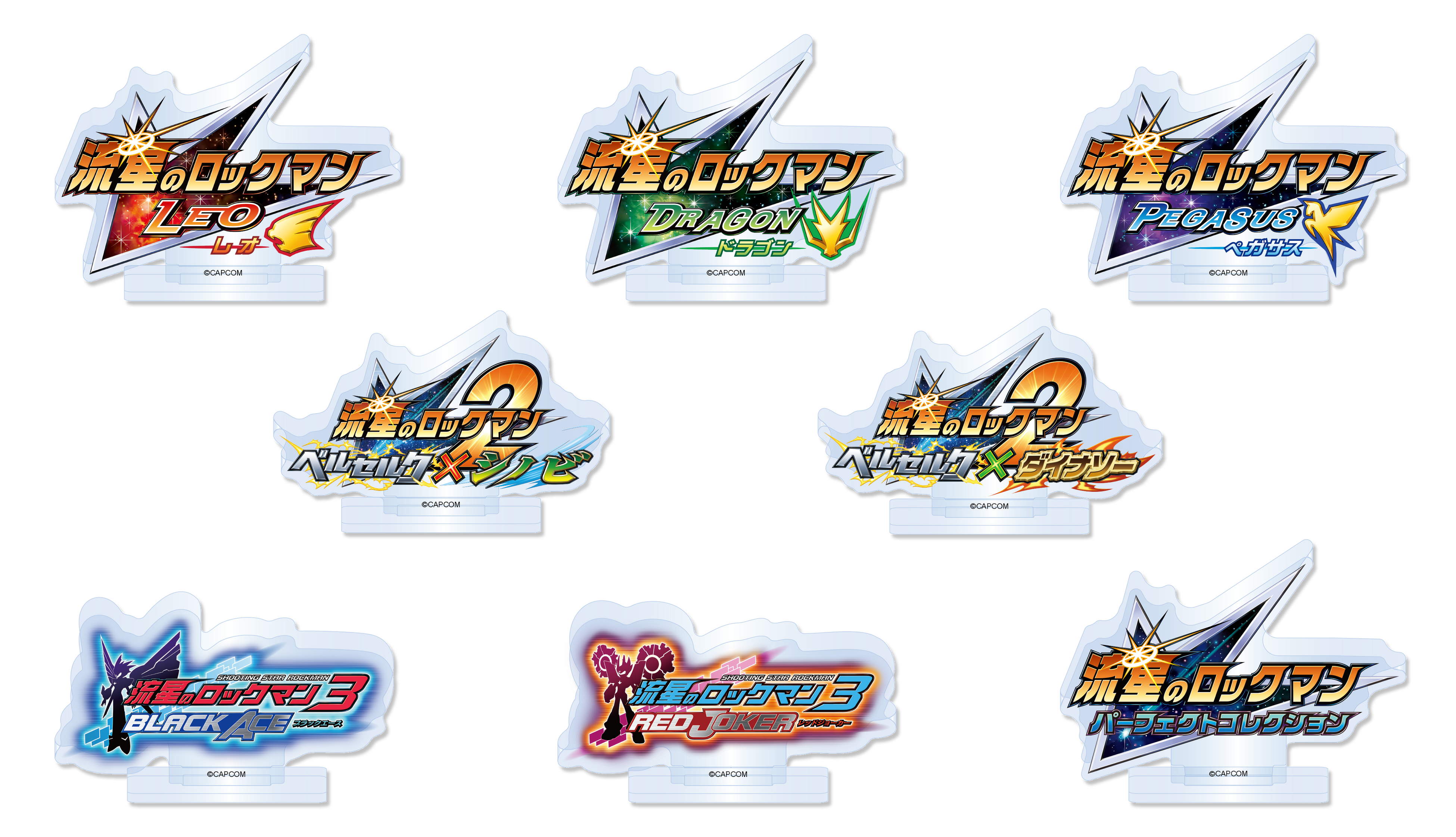 『流星のロックマン』にてロックマンが変身した「スターフォース」の姿をかわいくデフォルメ化した「マスコットぬいぐるみ(S賞)」や『流星のロックマン3』にて登場する「ノイズチェンジ」のデザインを使用した「アクリルスタンド(B賞)」など、各タイトルに登場するロックマンの変身姿を使用したアイテムを多数展開! ほかにも全8タイトルのロゴを使用した「アクリルブロックスタンド(C賞)」などのコレクタブルなアイテムもご用意しております。