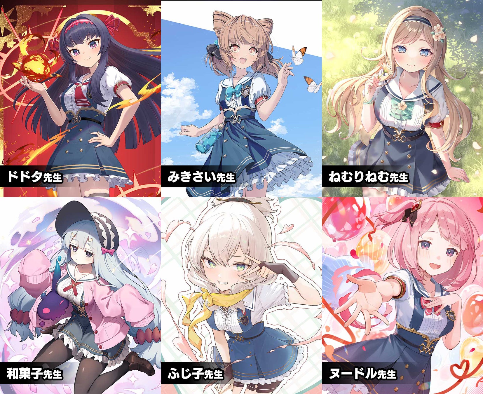 学園編では、ドドタ先生、みきさい先生、ねむりねむ先生、ふじ子先生、和菓子先生、ヌードル先生描き下ろしの学園乙女&エリオが登場します。