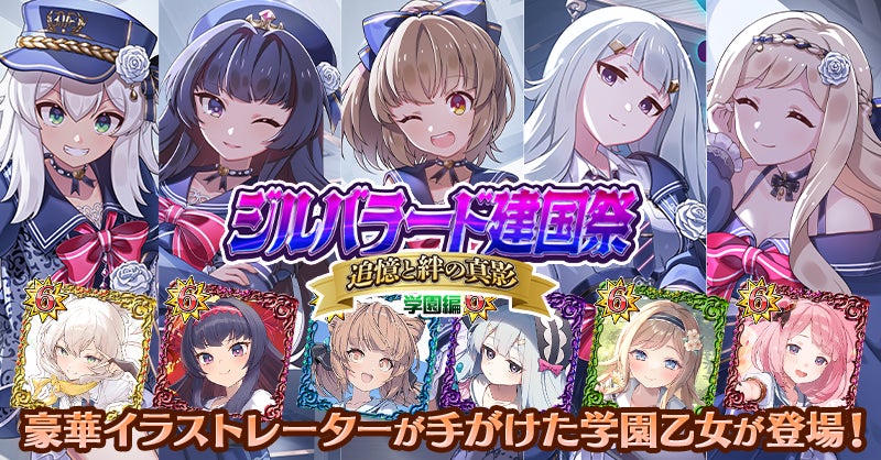 11周年記念イベント第二弾として、「カレン」「チコ」「カモミール」「アンゼリカ」「ルベリス」の学園乙女をメインとしたイベント『ジルバラード建国祭 追憶と絆の真影 学園編』を開催中です。