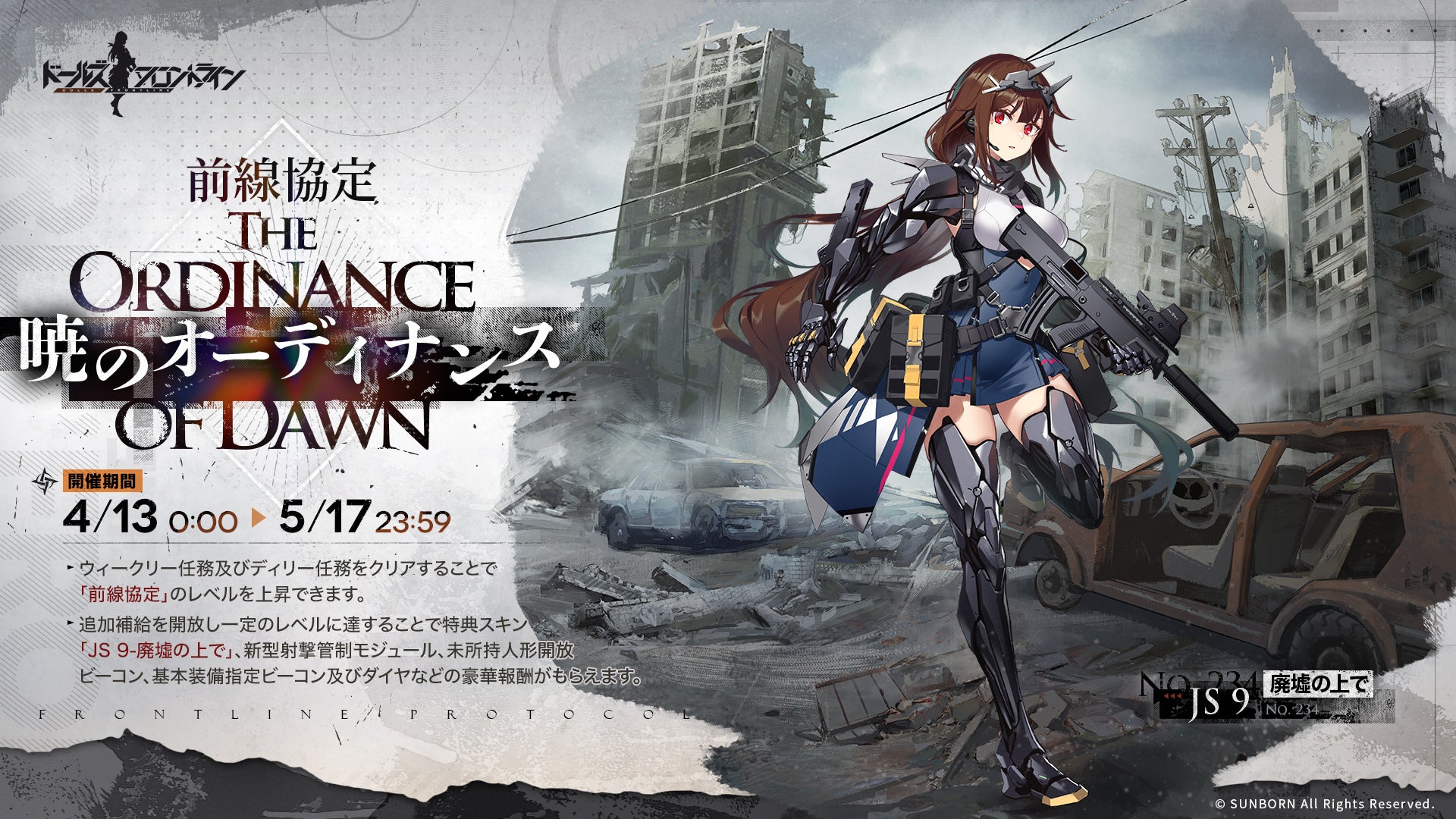 ウィークリー任務とデイリー任務をクリアすることで「前線協定」のレベルが上昇し、新型射撃管制モジュールや未所持人形解放ビーコンなどの豪華報酬がもらえる『前線協定 暁のオーディナンス』を「4月13日(月)0:00」より開催します。
