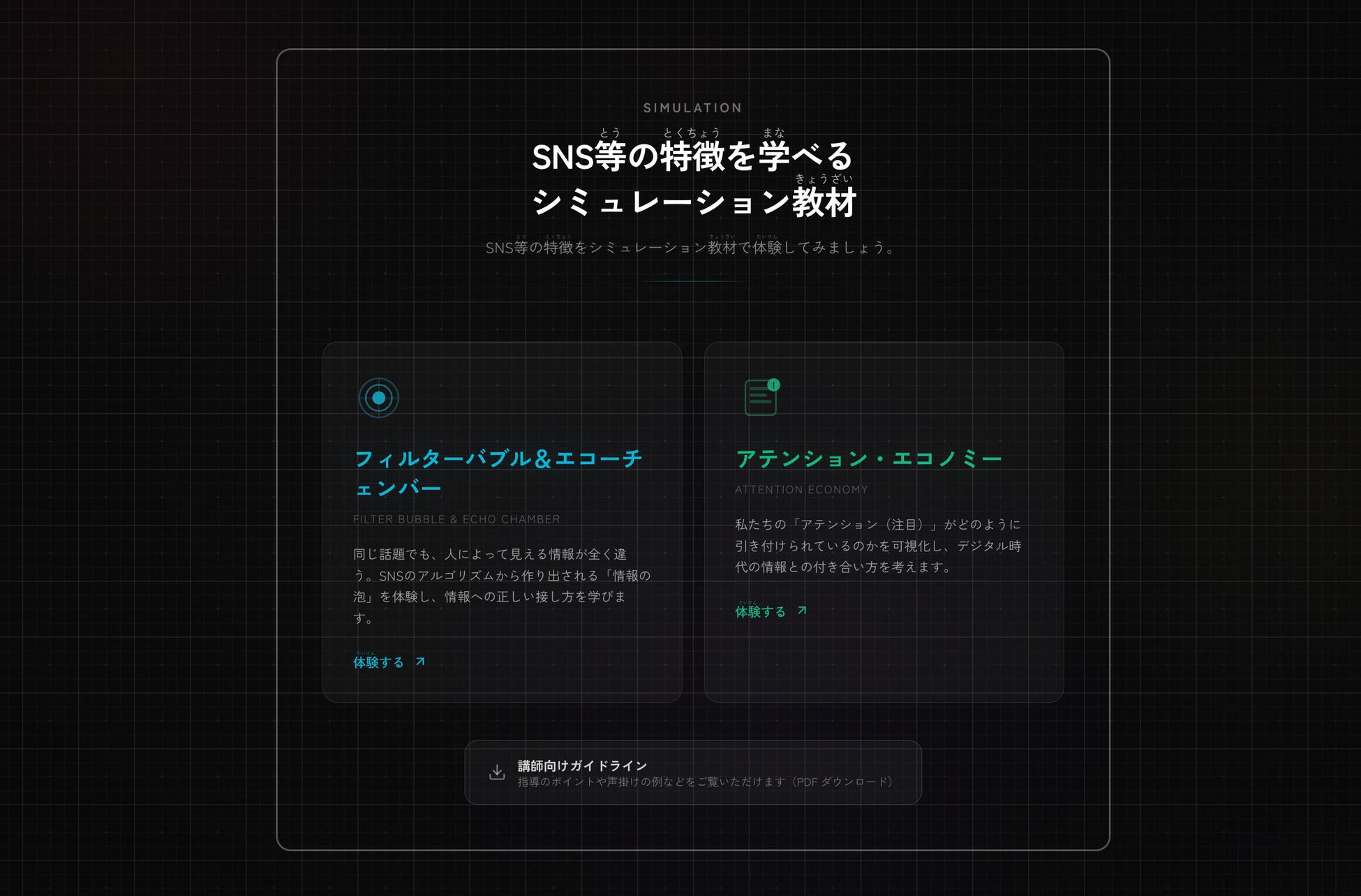 また、今回の公開では、SNS等の特徴を理解するためのシミュレーション教材として、「アテンション・エコノミー」と「フィルターバブル」「エコーチェンバー」に関する教材も公表しました。これらの教材は、インターネットやSNSの利用のなかで、なぜ特定の情報に注目が集まりやすいのか、なぜ似た意見や価値観に囲まれやすくなるのかといった、現代の情報接触の構造を理解するためのものです。講師用ガイドラインも公開しており、講座や授業等での活用も想定しています。