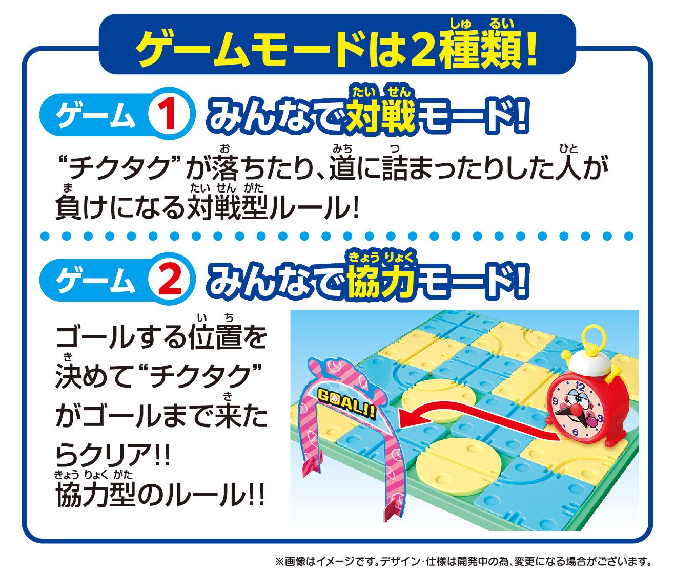 本商品のメインゲームは、道筋がついているパネルをスライドさせて、チクタク(目覚まし時計キャラクター)の進む道がとぎれないようにパネルをつないでいく対戦型パズルゲームです。プレーヤーは順番にパネルを動かし、自分の番でチクタクが進めなくなったプレーヤーが負けとなります。スピード切り替えスイッチ付きで、「はやい」「おそい」2段階選べます。