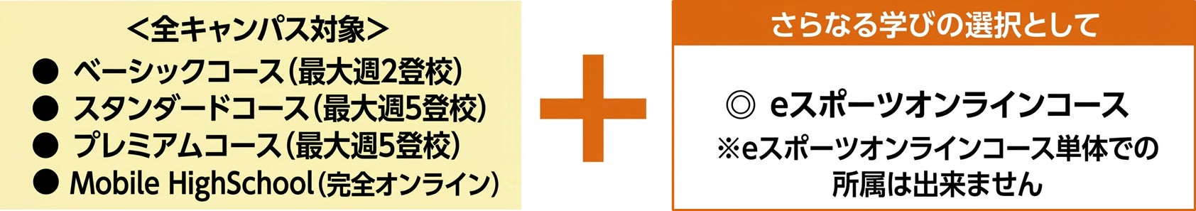 本コースは『ベーシックコース(最大週2登校)』 『スタンダードコース(最大週5登校)』 『プレミアムコース(最大週5登校)』に在籍している生徒が普段通っている最寄りのキャンパスでの学習に加えて、eスポーツのオンライン授業を受講できるコースです。また、『Mobile HighSchool』を選択した場合は、自宅でのレポート学習を中心としながら、同様にオンライン授業を受講することができます。