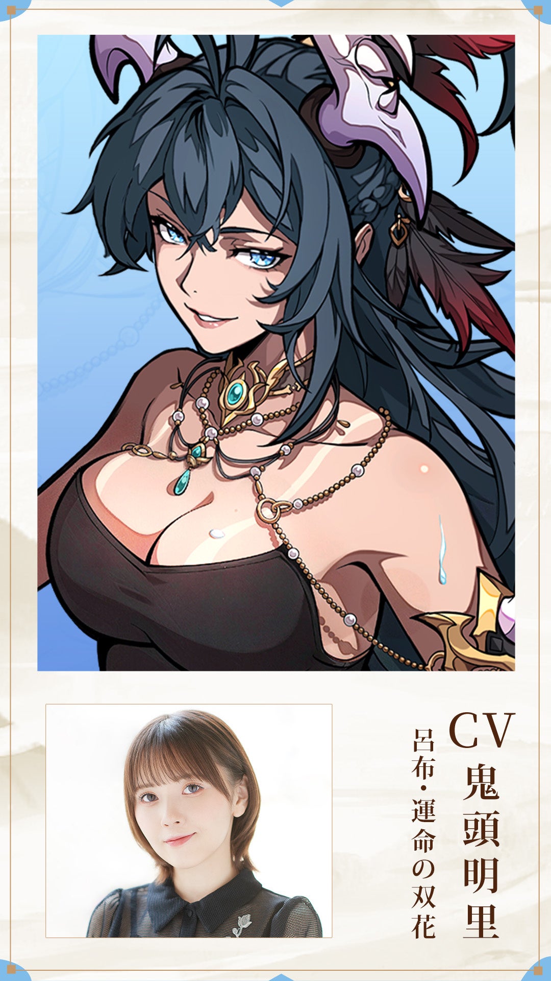 超人気声優・鬼頭明里さんが本作を牽引し、女体化された呂布と趙雲の2役を担当。