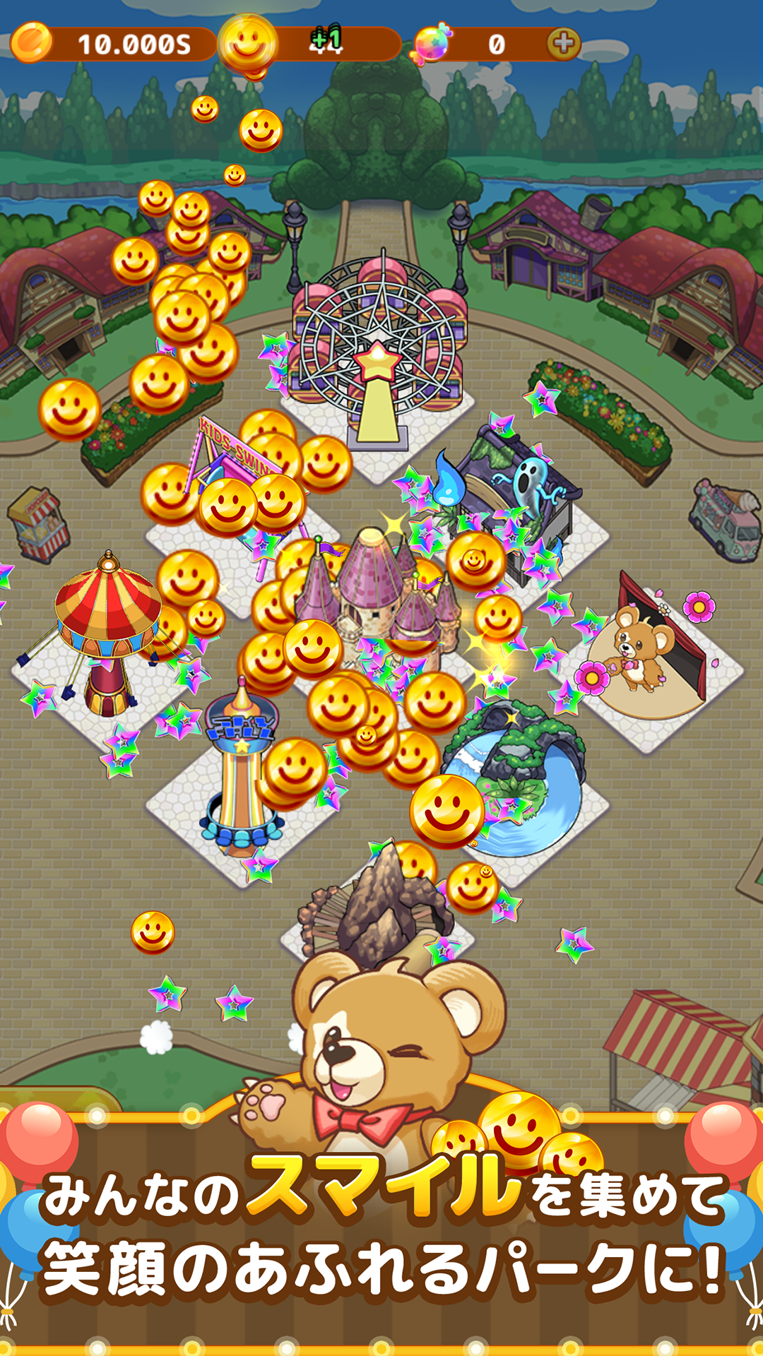 遊園地を発展させるとボーナス付きで再スタートできる「スマイルチェンジ」が解放。繰り返すほど効率が上がり、より大きな遊園地を目指せます。