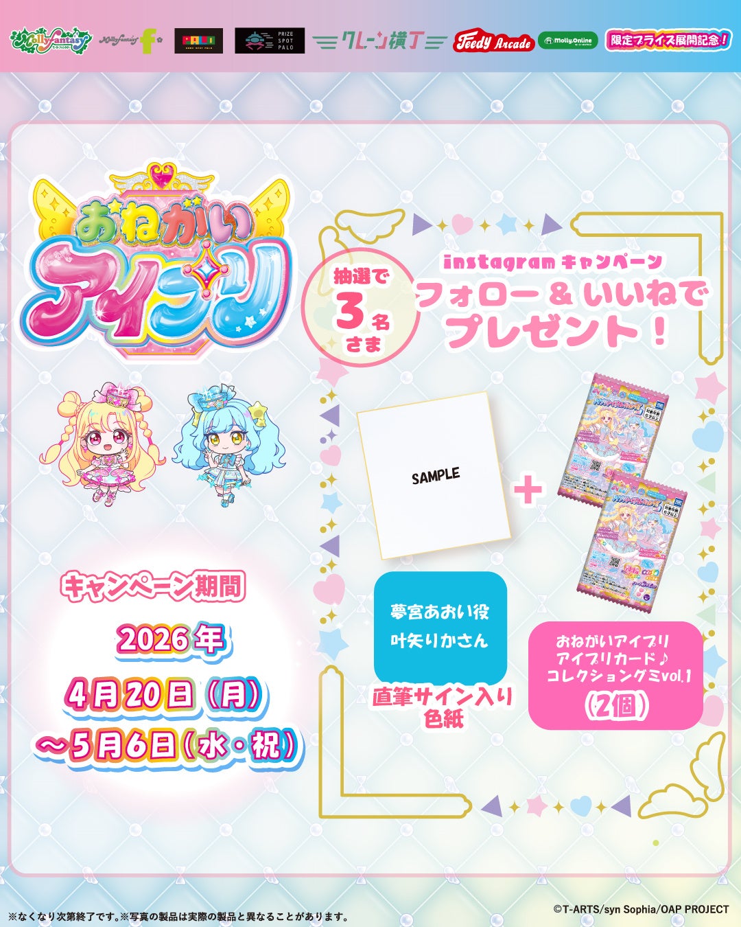 限定プライズ用景品の展開を記念し、モーリーファンタジー公式X・Instagramでは、「夢宮あおい役 叶矢りかさまのサイン色紙&アイプリカード♪コレクショングミvol.1(2個)」が抽選で各3名さまに当たるSNSキャンペーンを開催いたします。詳細は公式アカウントをご確認ください。
