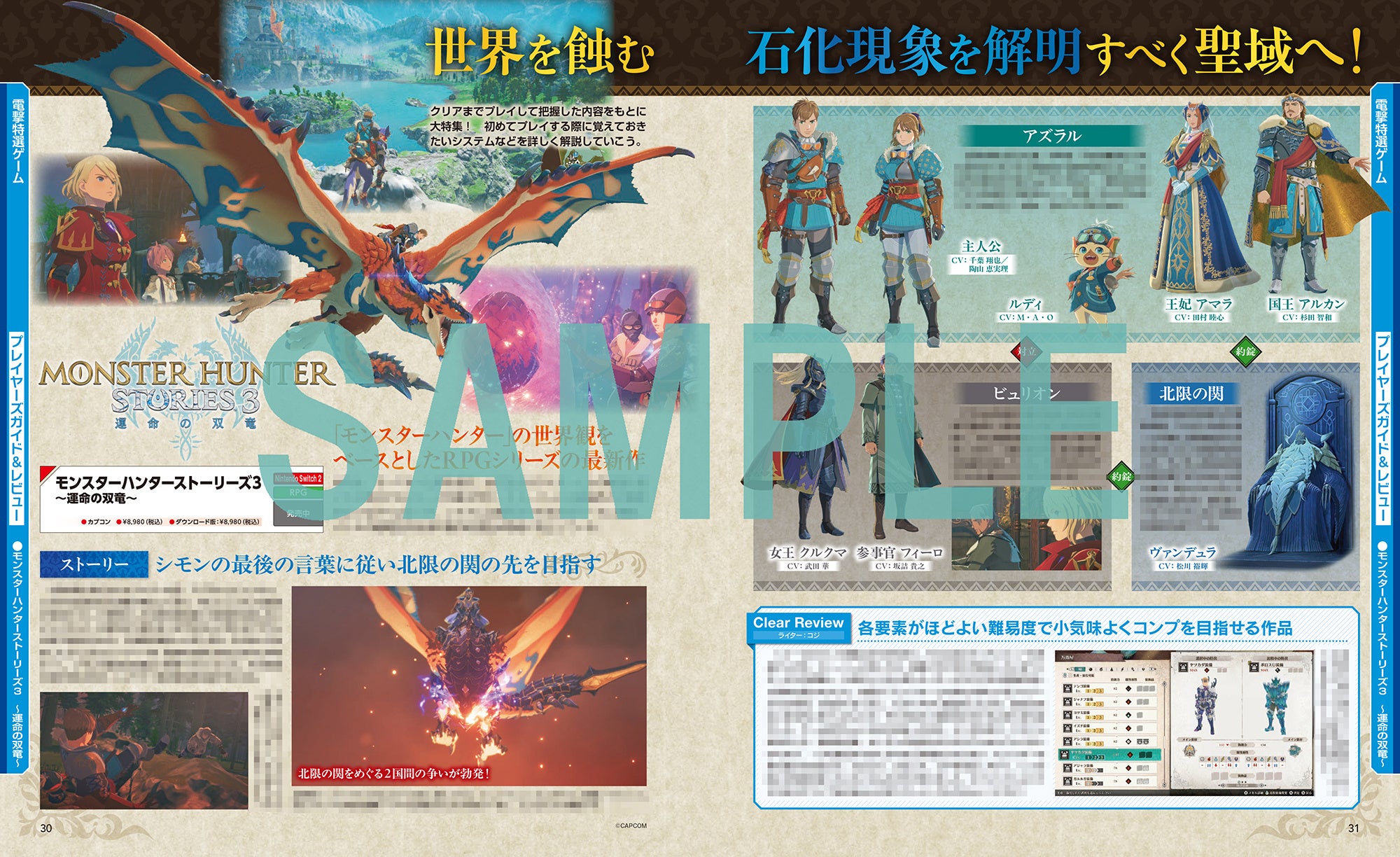 『モンスターハンターストーリーズ3 ~運命の双竜~』(カプコン)の特集では、10ページに渡って、ストーリー/キャラクター/フィールド/オトモン/バトルの5つのカテゴリ別に徹底解説!