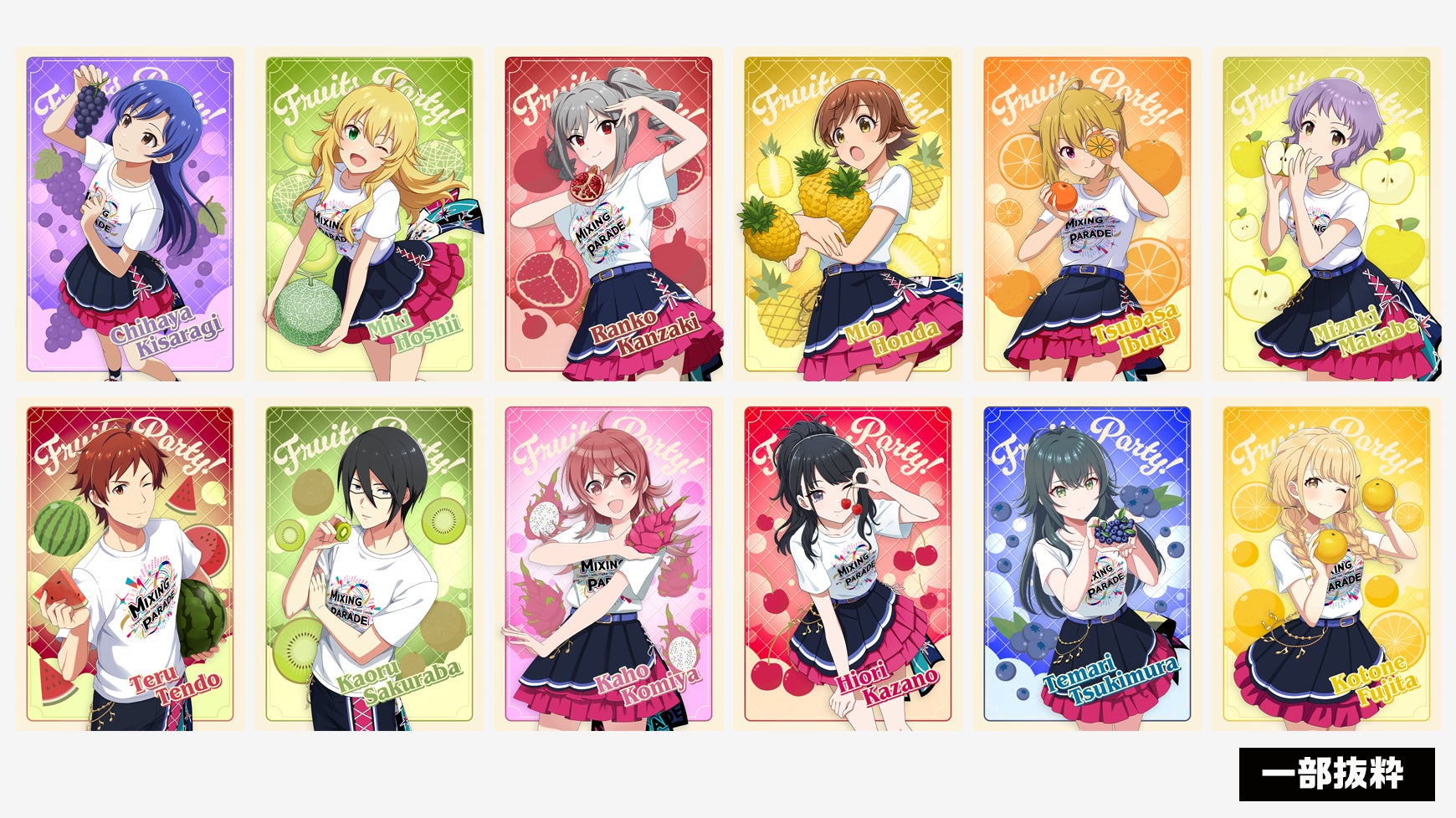「COレア(コンセプトレア)」として、特殊な印刷加工が施されているカードが登場します。今回のコンセプトは「フルーツパーティー」。アイドルたちがフレッシュなフルーツを持って撮影に挑むようすが描かれたカードです。