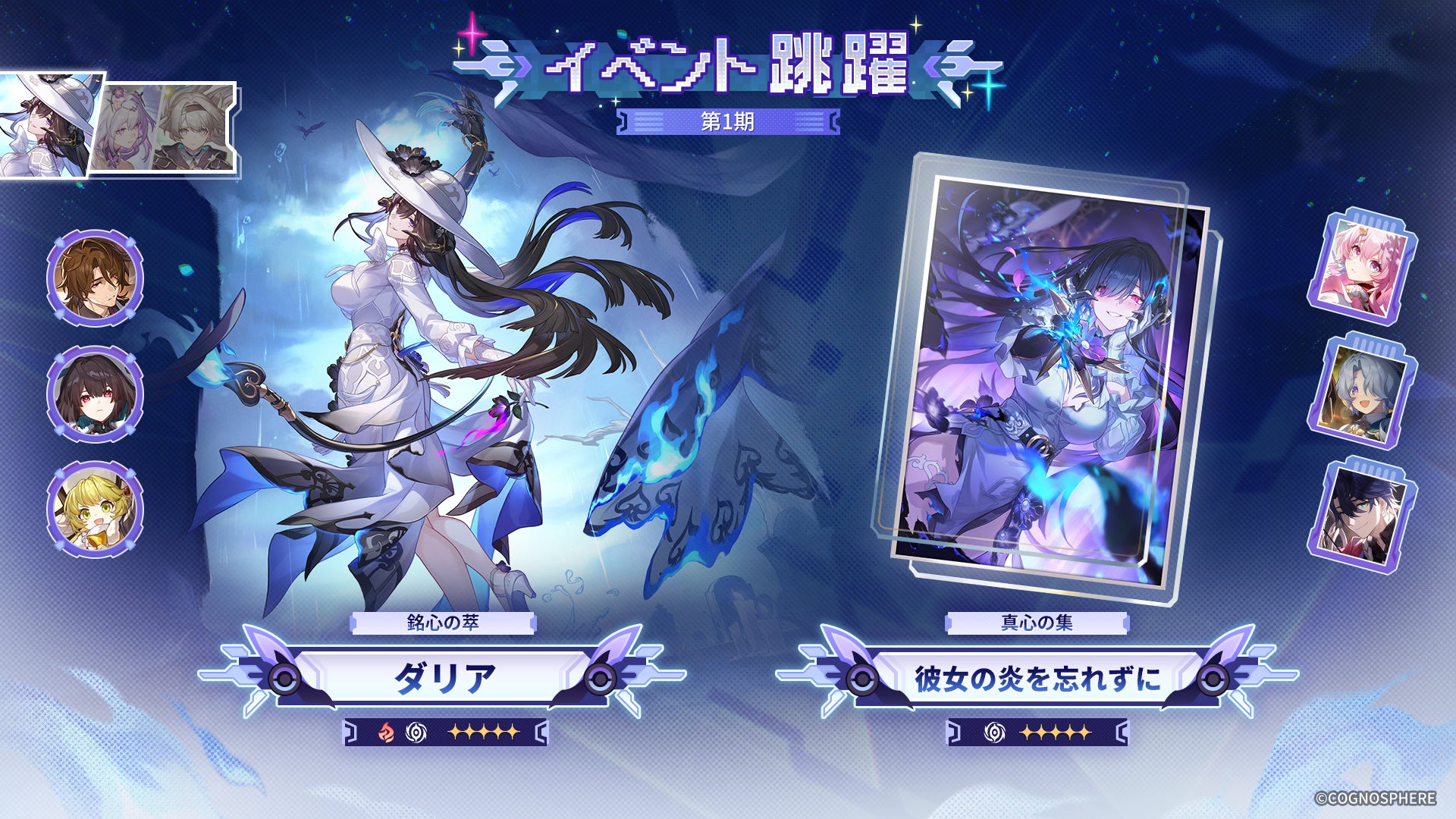 また、同時開催のイベント跳躍・光円錐では、限定星5光円錐「永訣よ美しくあれ(虚無)」「彼女の炎を忘れずに(虚無)」「夢が帰り着く場所(壊滅)」の出現率がアップ!