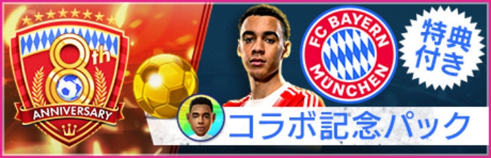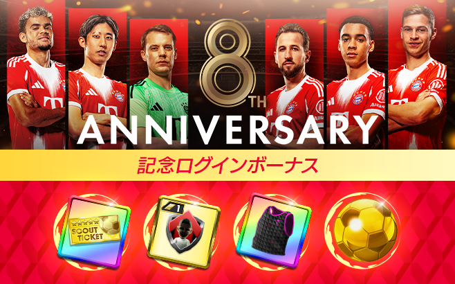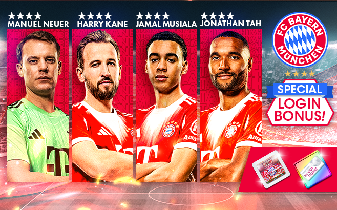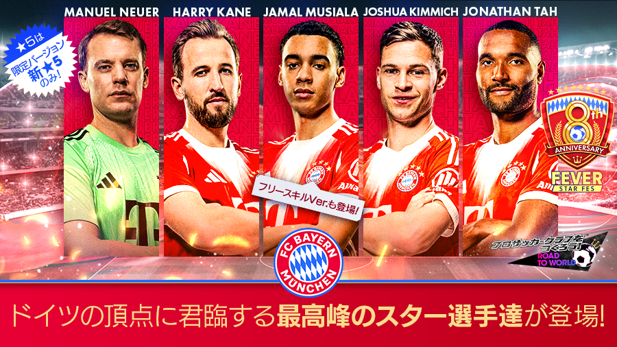 「マヌエル・ノイアー」「ハリー・ケイン」「ヨシュア・キミッヒ」「ジャマル・ムシアラ」「レナート・カール」「アレクサンダー・パヴロヴィッチ」「アルフォンソ・デイビス」「ヨナタン・ター」「ニコラス・ジャクソン」といったFCバイエルン・ミュンヘンのスーパースターが、得意戦術中央突破の新★5選手として登場する“8th Anniversary FEVER STAR FES”を開催! 今回はフリースキルバージョンの「ジャマル・ムシアラ」も登場するほか、スカウトに登場する新★5選手の★4バージョンが手に入る“スペシャルログインボーナス”も実施します。