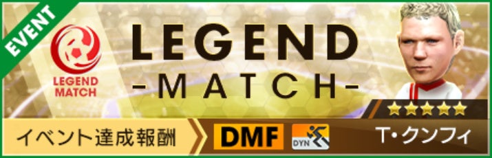 “レジェンドマッチ”は、レジェンドチームと対戦し、勝利ポイントゲージが一定量に達すると豪華なアイテムが獲得できるイベントです。今回の“レジェンドマッチ”では、10,000pt達成報酬の★5選手が入れ替わり、新★5選手「T・クンフィ」が登場します。