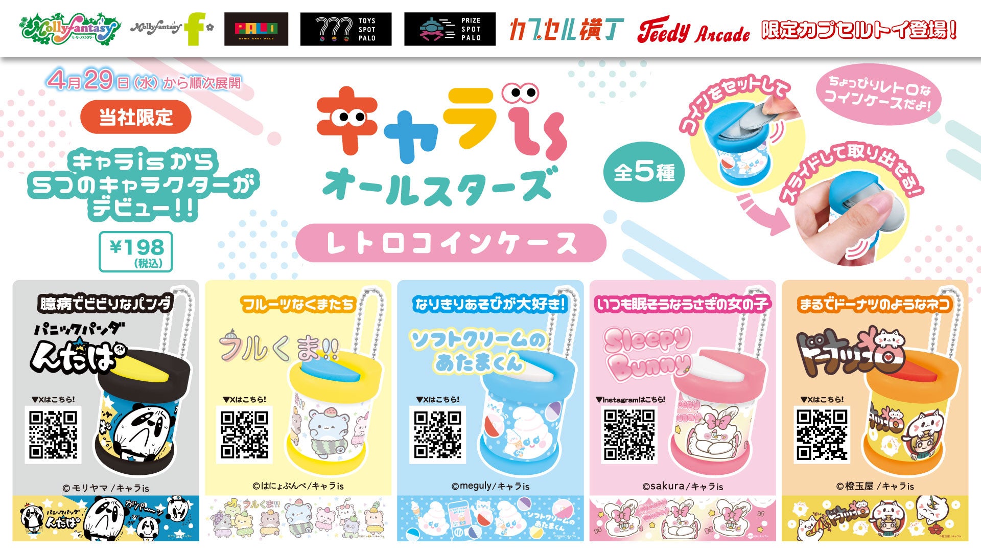 株式会社イオンファンタジー(本社:千葉県千葉市、代表取締役社長:藤原徳也、以下、当社)は、当社が運営するオリジナルキャラクター特化型プラットフォーム「キャラ is」(URL: https://charaise.jp/)から生まれたキャラクター「パニックパンダ んだぱ」、「フルくま!!」、「ソフトクリームのあたまくん」、「SleepyBunny」、「ドーナツ猫」のカプセルトイ用商品「キャラisオールスターズ レトロコインケース」を、アミューズメント施設「モーリーファンタジー」「PALO」、カプセルトイ専門店「TOYS SPOT PALO」「カプセル横丁」などに設置する当社オリジナル完全キャッシュレスカプセルトイマシン「かぷえぼ」にて4月29日(水・祝)より順次展開いたします。